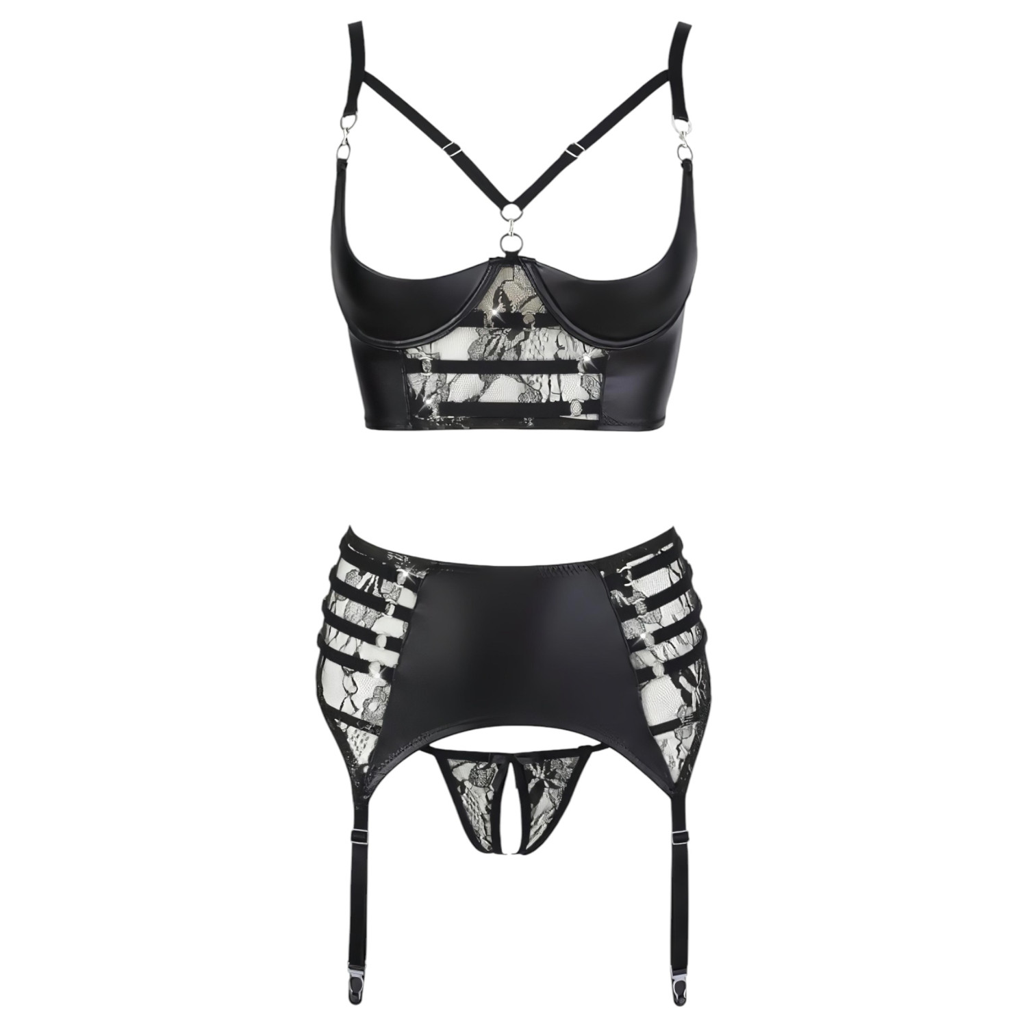 Conjunto de lencería premium y atrevido, que hará tu apariencia inolvidable con encaje sensual, elementos metálicos brillantes y tiras refinadas.