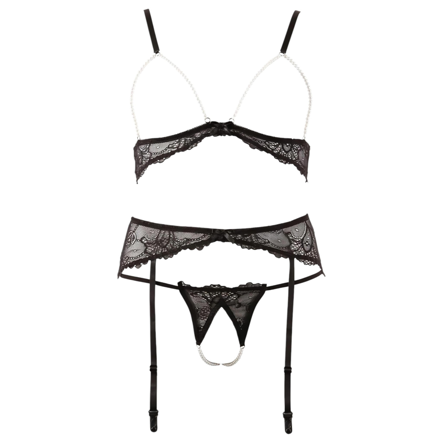 La combinación de encaje sexy y detalles de perlas es elegante y provocativa a la vez. Los tirantes ajustables del sujetador y el liguero aseguran un ajuste perfecto a tu cuerpo, mientras que el tanga abierto garantiza la máxima seducción. Este conjunto no es solo lencería: es una experiencia sensual que resalta tu feminidad y potencia tu confianza.