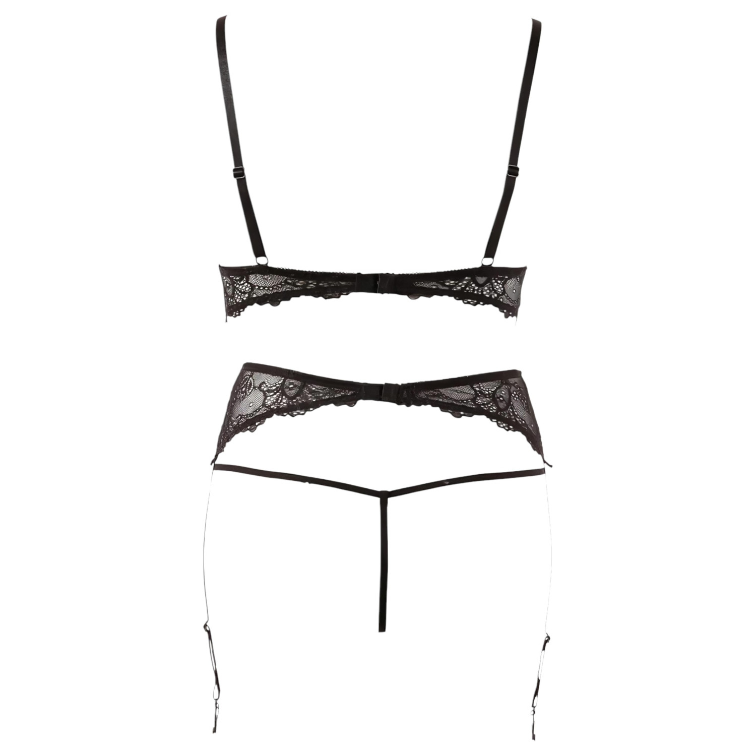 Ponte el sujetador y ajusta los tirantes para un ajuste perfecto. Abrocha el cinturón del liguero y combina el conjunto con tus medias favoritas para un efecto completamente encantador. El tanga abierto asegura que la seducción esté presente en cada momento.