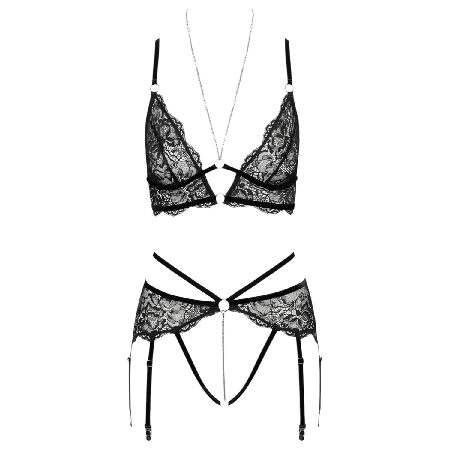 Sujetador y tanga abiertos de encaje seductor con liguero incluido – ¡El conjunto de sujetador abierto de encaje Abierta Fina es la elección más provocativa si deseas causar una impresión verdaderamente especial!