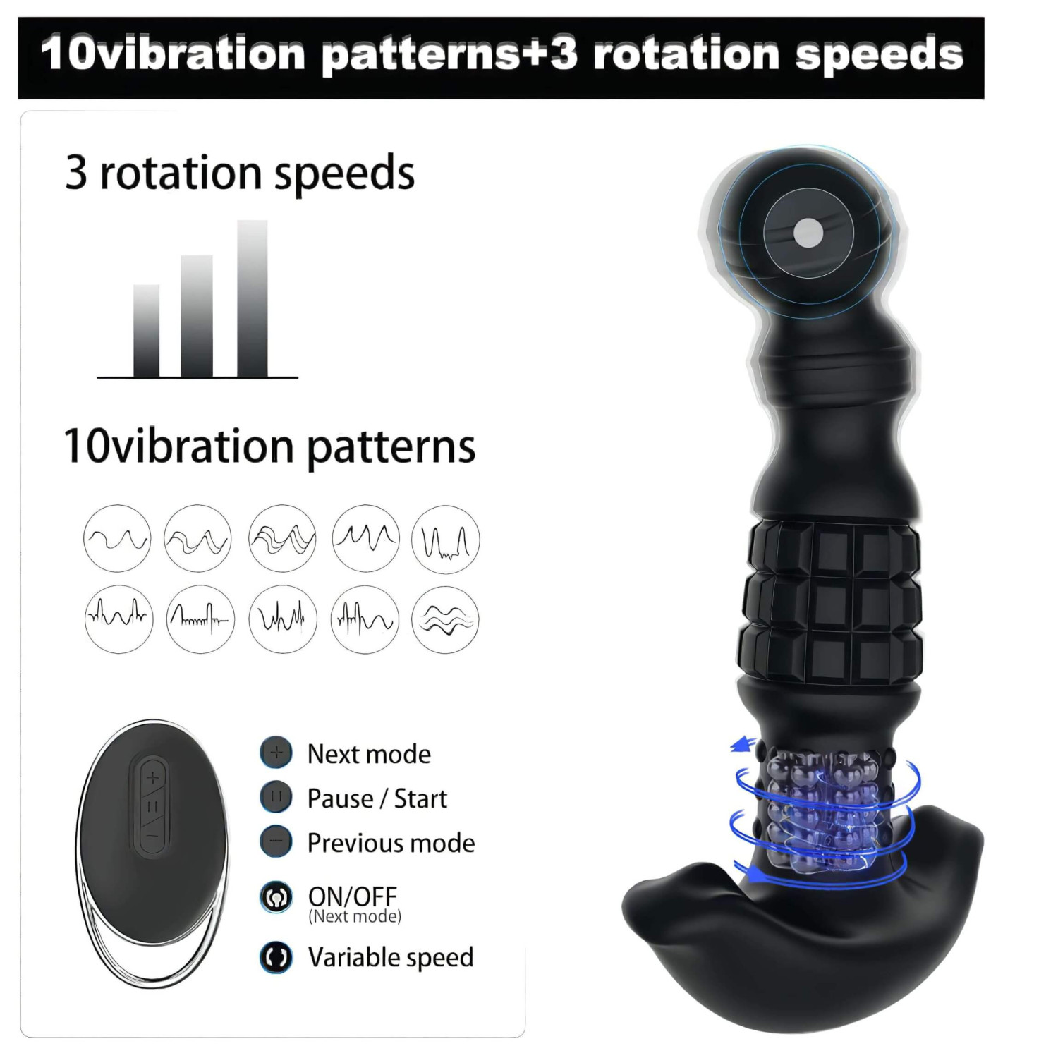 • Con los botones + y - alternas entre los modos de vibración y rotación, y con el botón del centro puedes pausar el placer.