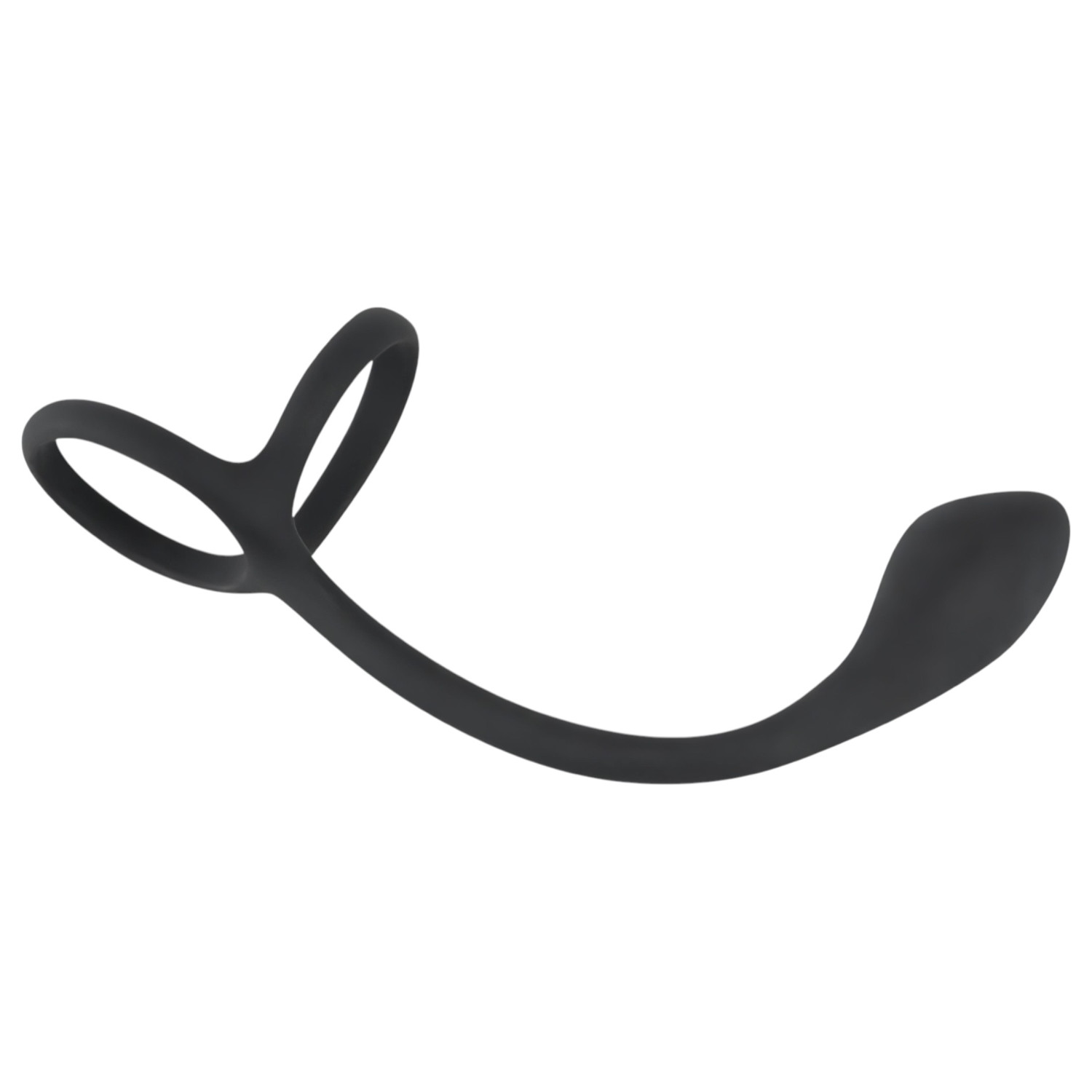 Este producto es un anillo para pene y testículos con sujeción firme, elástico y de tacto aterciopelado, al que va unido un dildo anal con cabeza pronunciada mediante una correa flexible.