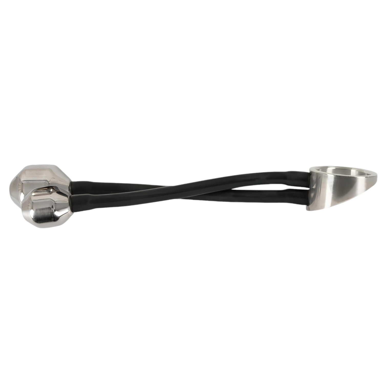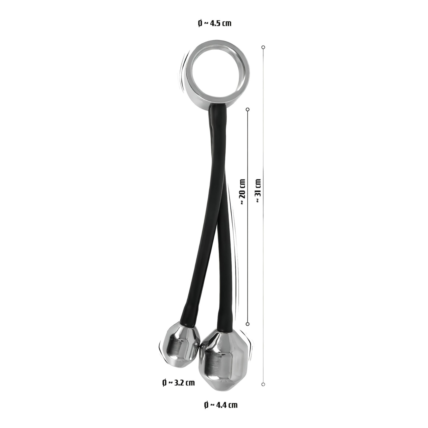 Con dos pesas colgantes que, al usarlas analmente, estimulan la próstata, y al dejarlas caer, provocan una intensa sensación de tirón.