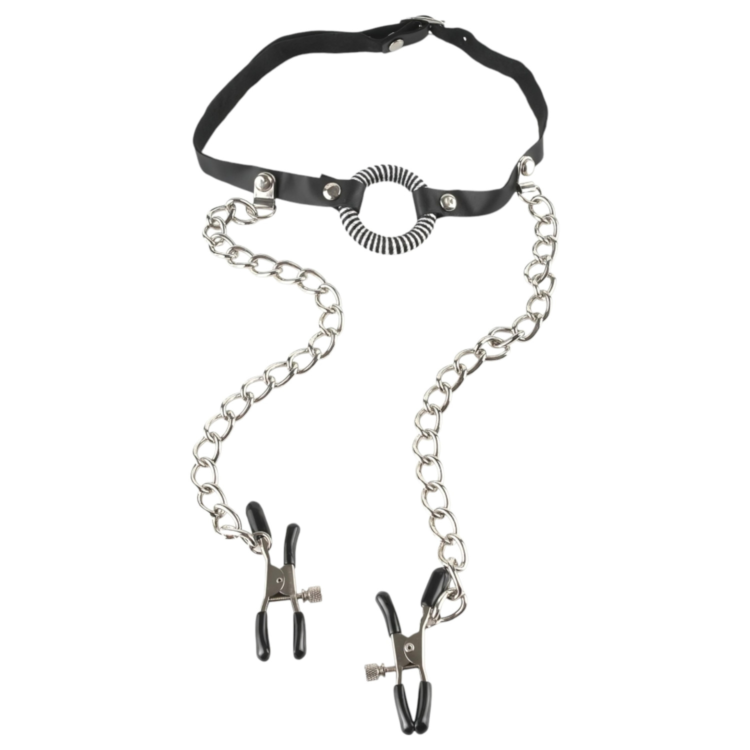 ¡Descubre la emoción del dominio y la sumisión con este set especial de anillo bucal con pinzas para pezones, que te silencia y te estimula al mismo tiempo!