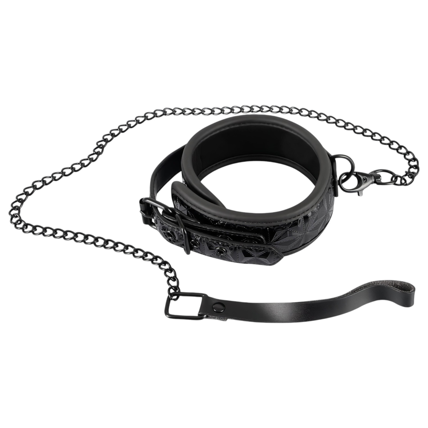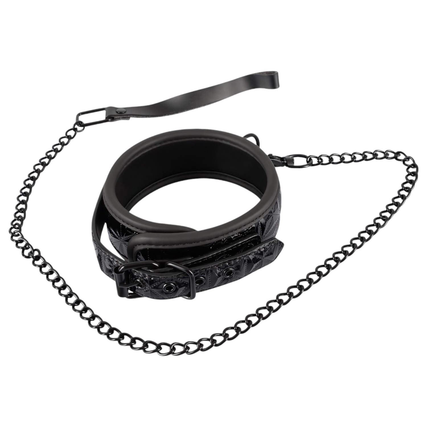 Lleva tu juego de dominancia y sumisión al siguiente nivel con este elegante collar acolchado de diseño diamante y su correa de cadena a juego.