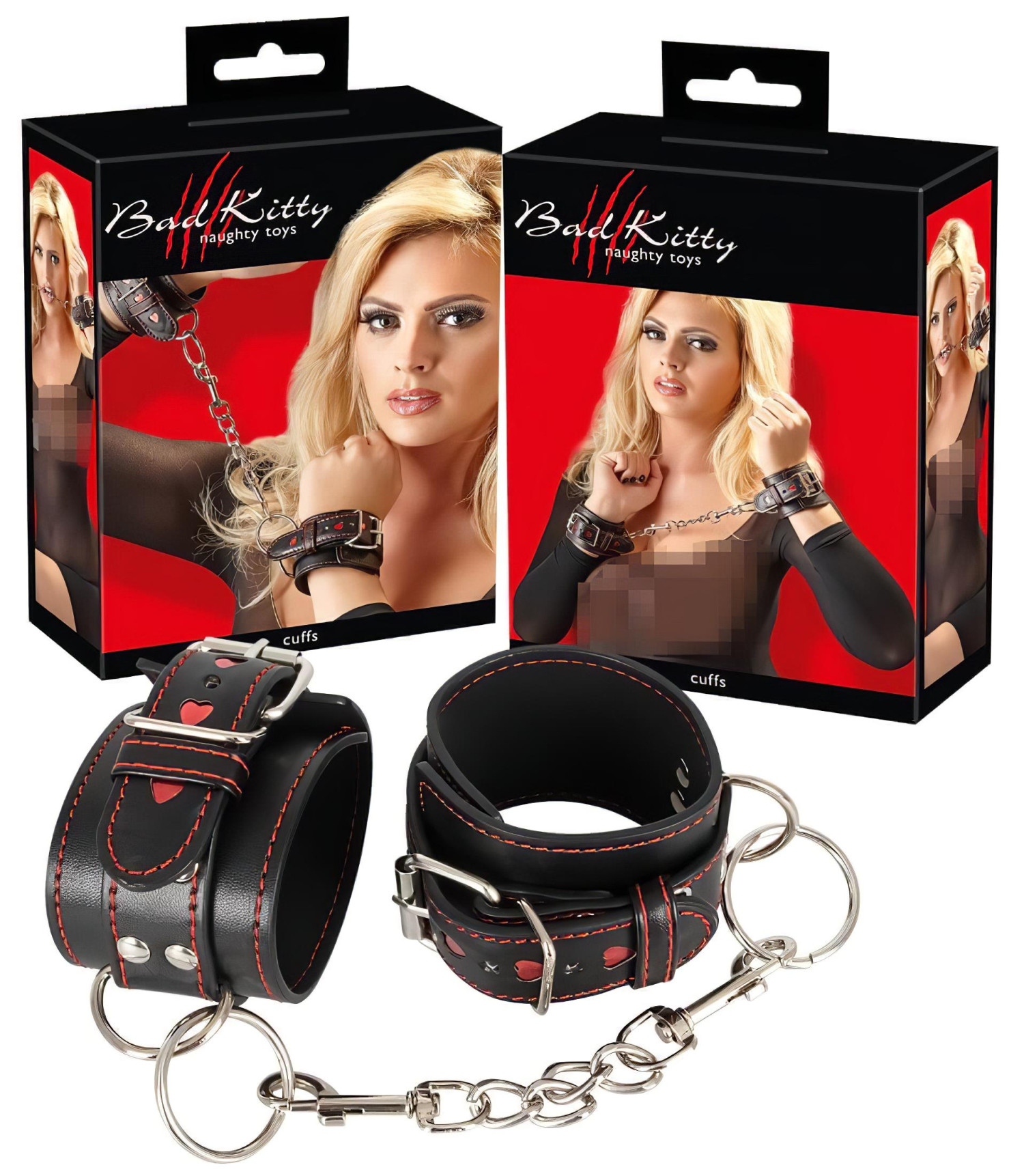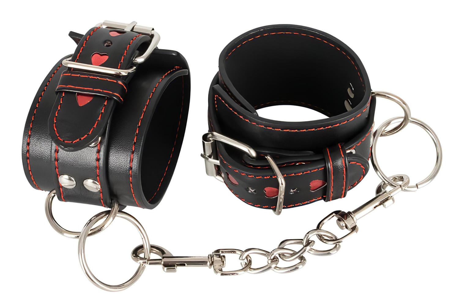 ¡Un par de esposas realmente románticas con las que descubrirás lo emocionante que es estar a merced de tu pareja!Esposas de alta calidad, hechas de material con efecto cuero, decoradas con brillantes y originales motivos de corazones y costuras rojas alrededor. Incorporan anillas metálicas de tipo D y aros.Ambas esposas están conectadas por una corta cadena de metal, que termina con pequeños mosquetones metálicos en cada extremo, por lo que puedes quitarlas fácilmente.