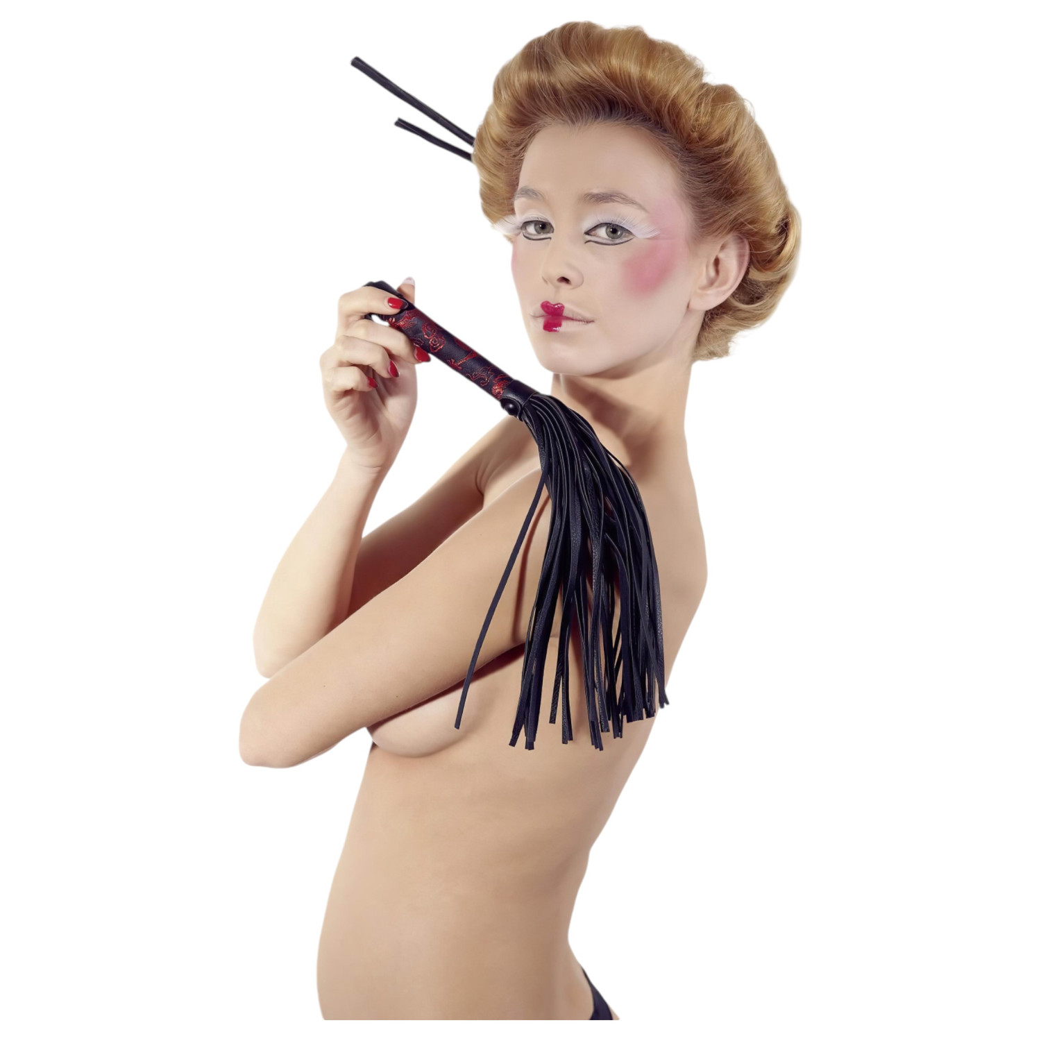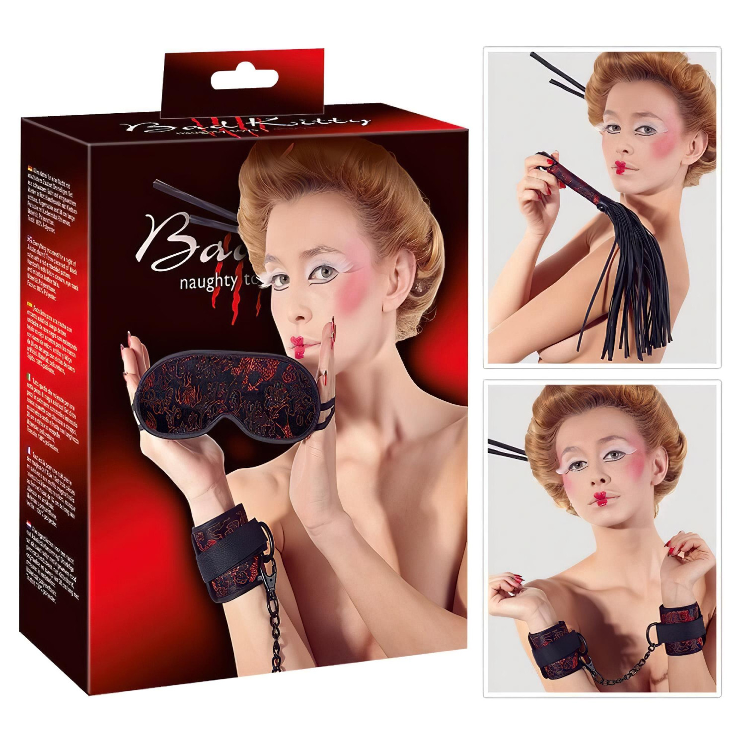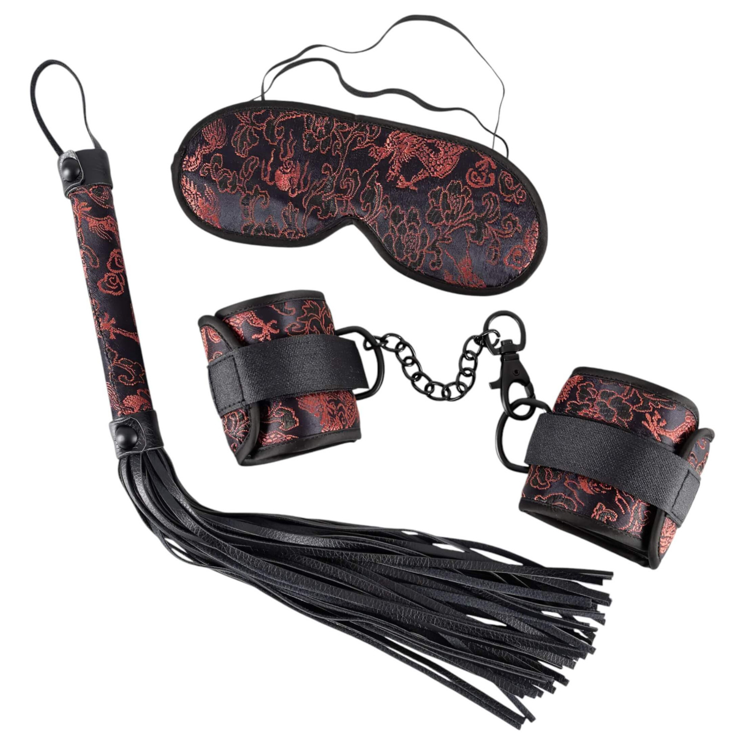 Descubre nuevas dimensiones de pasión con este elegante set de bondage de tres piezas, hecho de satén negro decorado con un toque de diseño rojo.