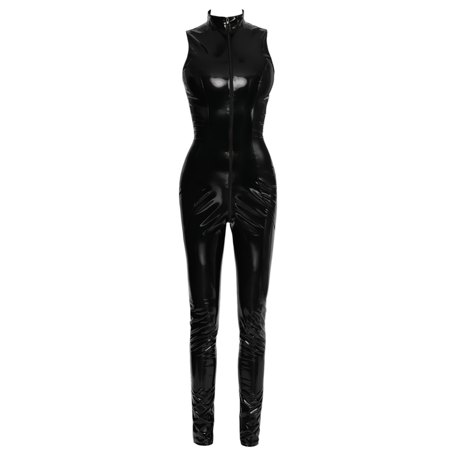 Descubre una nueva dimensión de la seducción con este impresionante mono sin mangas de vinilo negro, que se ajusta perfectamente a tu cuerpo y resalta tus curvas femeninas.