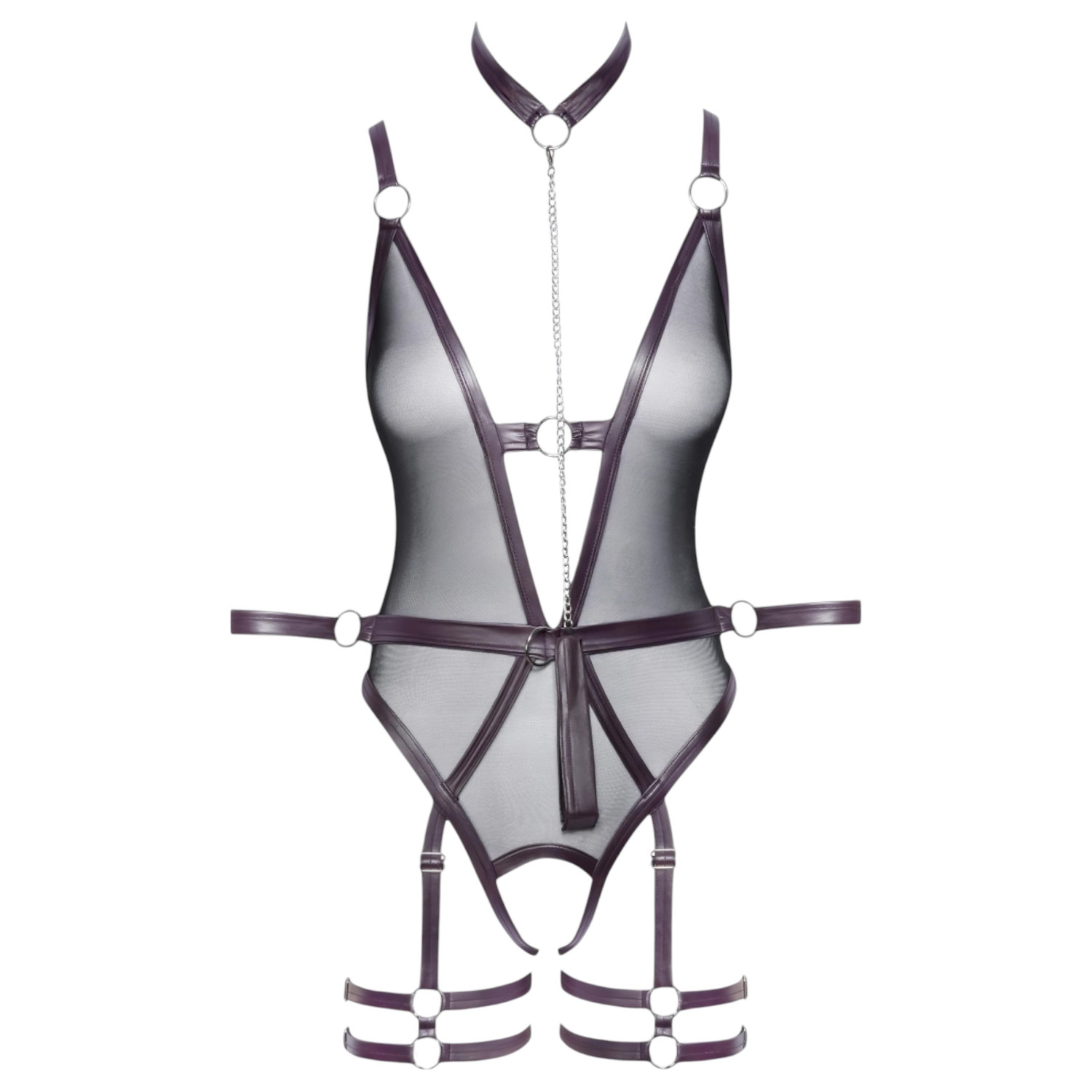 ¡Body estilo bondage abierto, con tirantes de liguero y sujeciones para las manos!