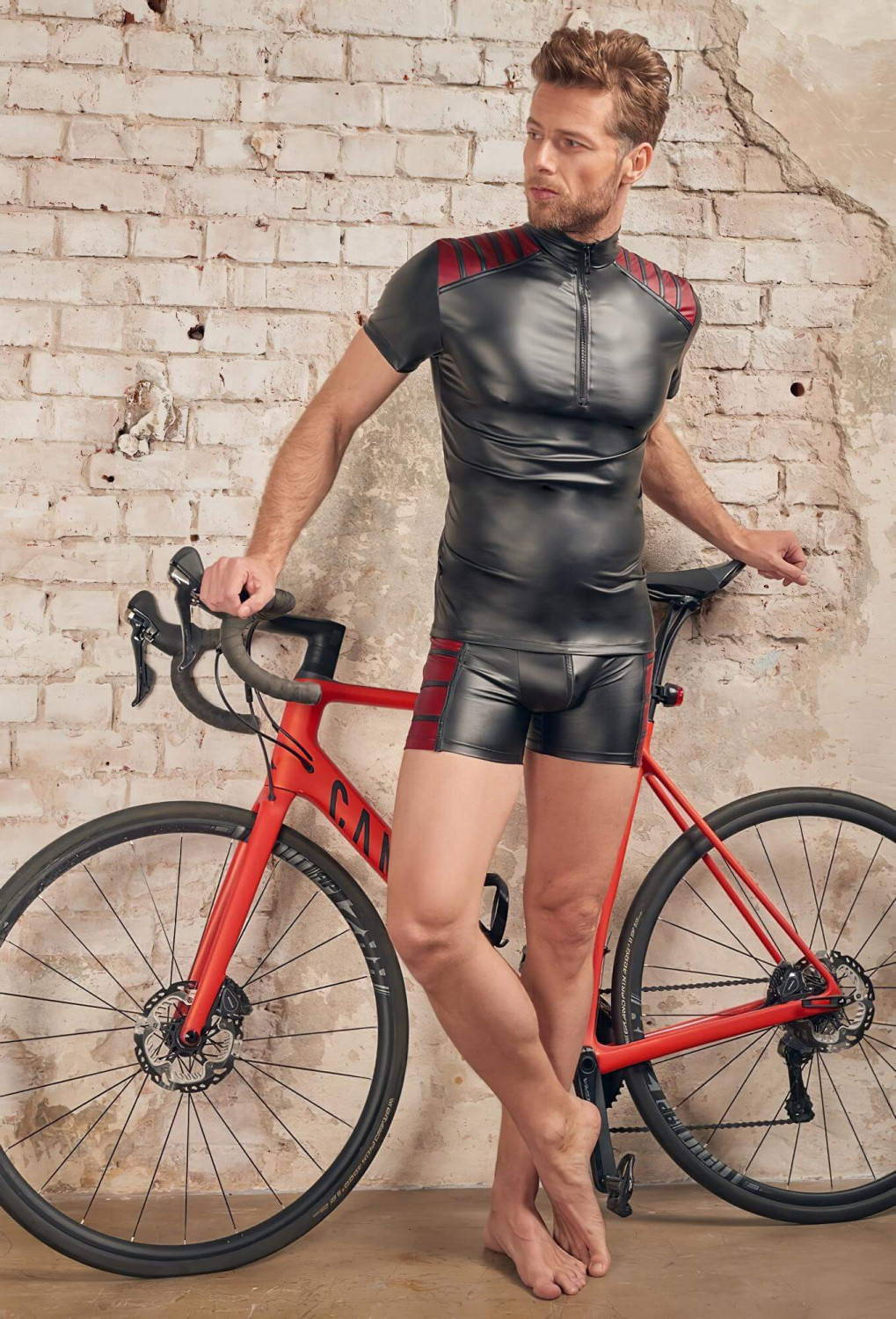 Una camiseta sexy para hombre hecha de material llamativo y brillante, con inserciones de rayas burdeos en los hombros.