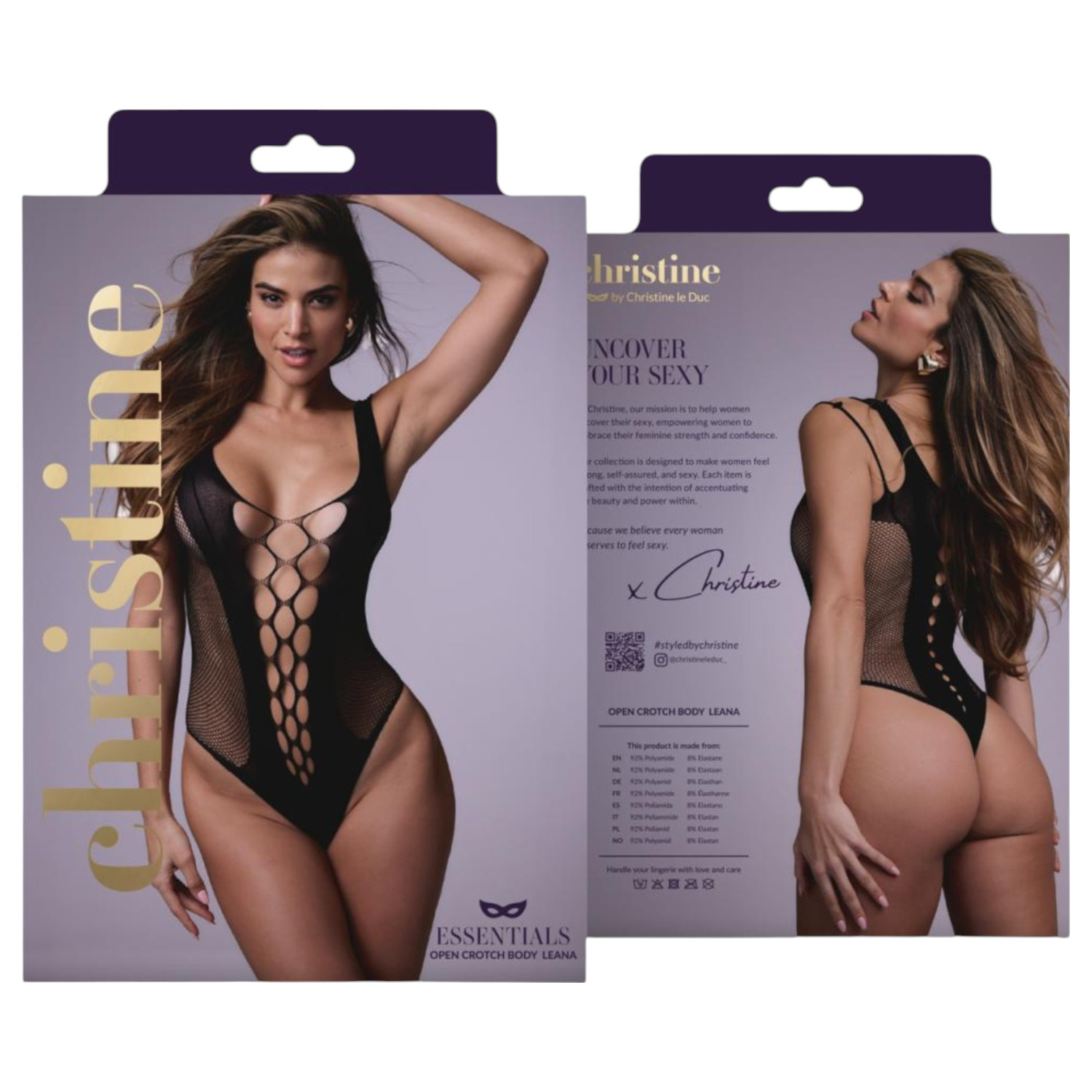 Leana fekete bodystocking con entrepierna abierta, detalles sensuales en los hombros y tejido de red decorativa: la opción perfecta si buscas un look atrevido, desenfadado e irresistible.