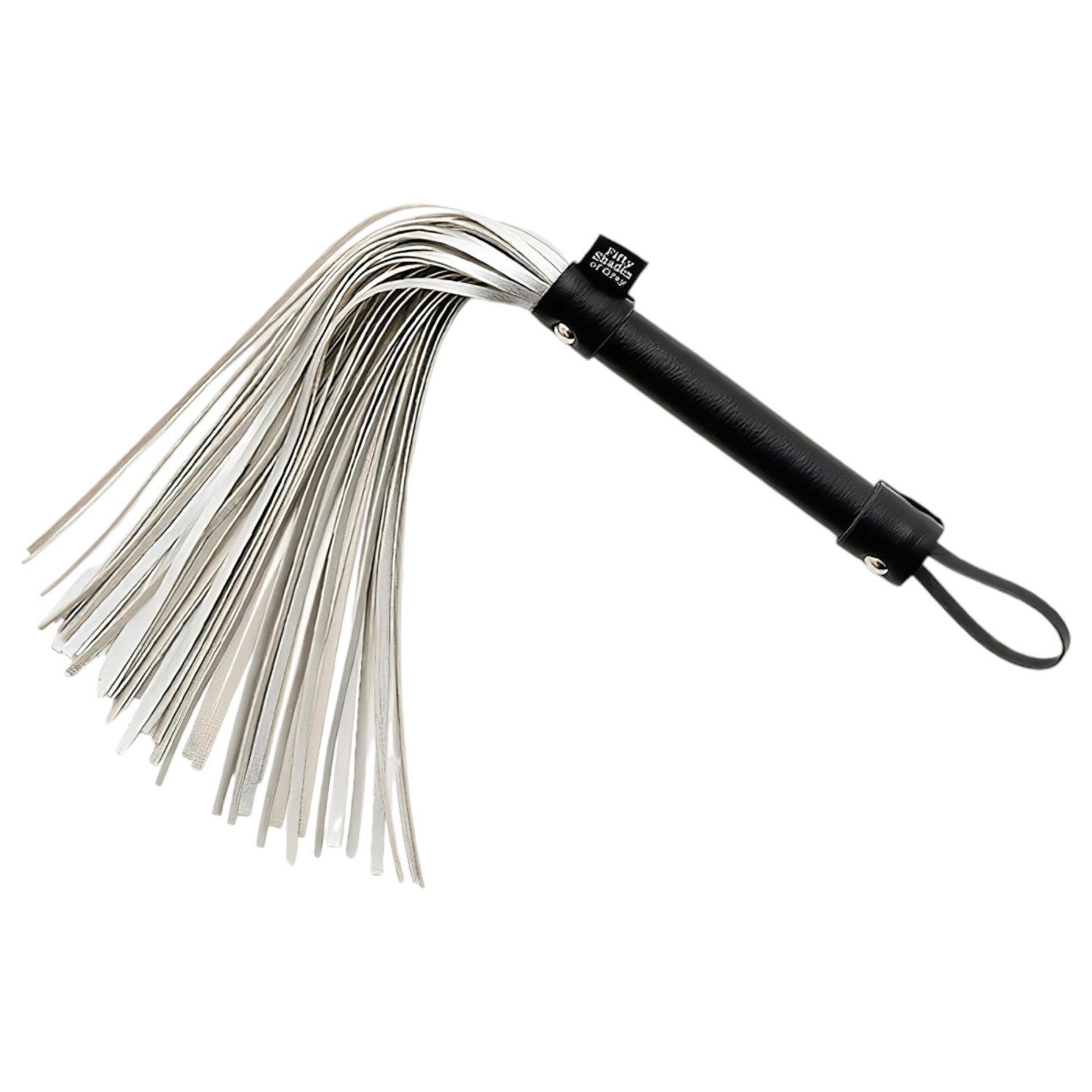 ¡Un látigo exclusivo de la colección de Cincuenta sombras de Grey! Presenta un diseño elegante, con tiras suaves de color plateado, mango de madera duradero forrado en piel negra y un práctico lazo para agarrar.