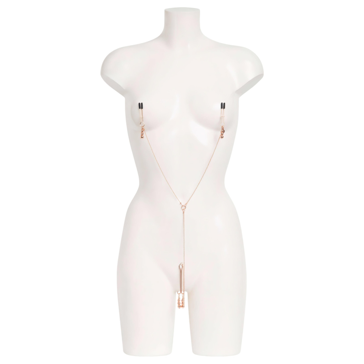 Este adorno para el clítoris y los pezones, unidos por una cadena, intensifica el placer sin dolor, sólo con una ligera sensación de presión.