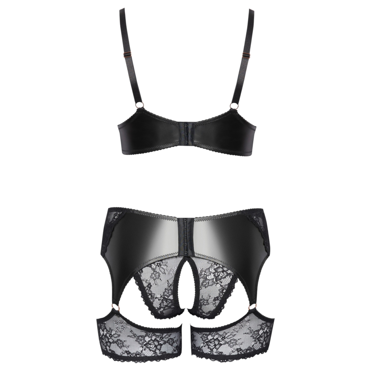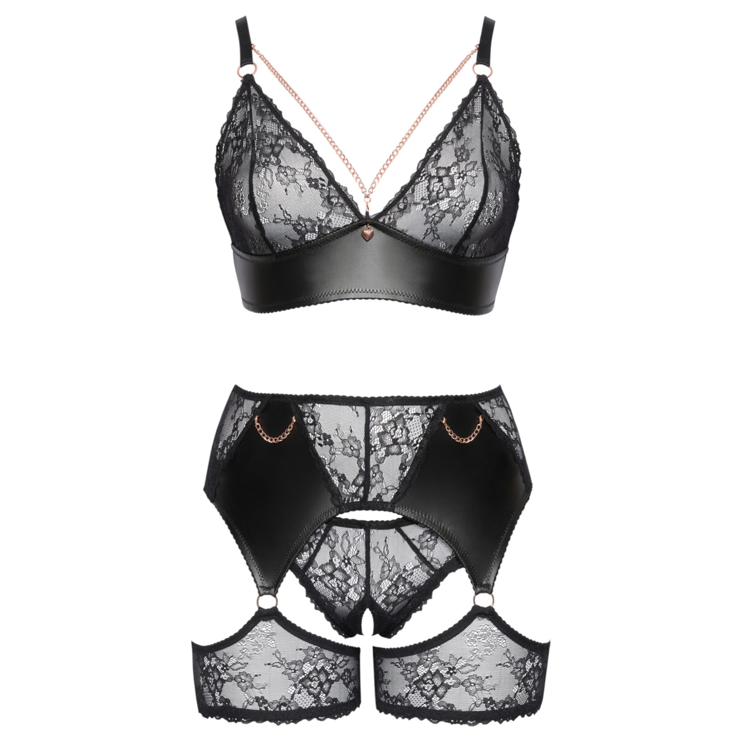 Este conjunto de lencería Cottelli Curves es la elección perfecta si buscas una apariencia sexy y femenina que sea a la vez elegante y audazmente erótica. El sujetador de encaje ofrece una sujeción cómoda y natural, mientras que las cadenas decorativas en oro rosa dirigen la mirada al escote. El cinturón con portaligas cuenta con cadenas decorativas en la parte frontal que hacen el conjunto aún más emocionante, y la tanga de encaje abierta asegura un efecto irresistible. El encaje suave y elástico proporciona un confort supremo, permitiendo que el conjunto se use durante toda la noche, ya sea para ocasiones románticas, traviesas o atrevidas.