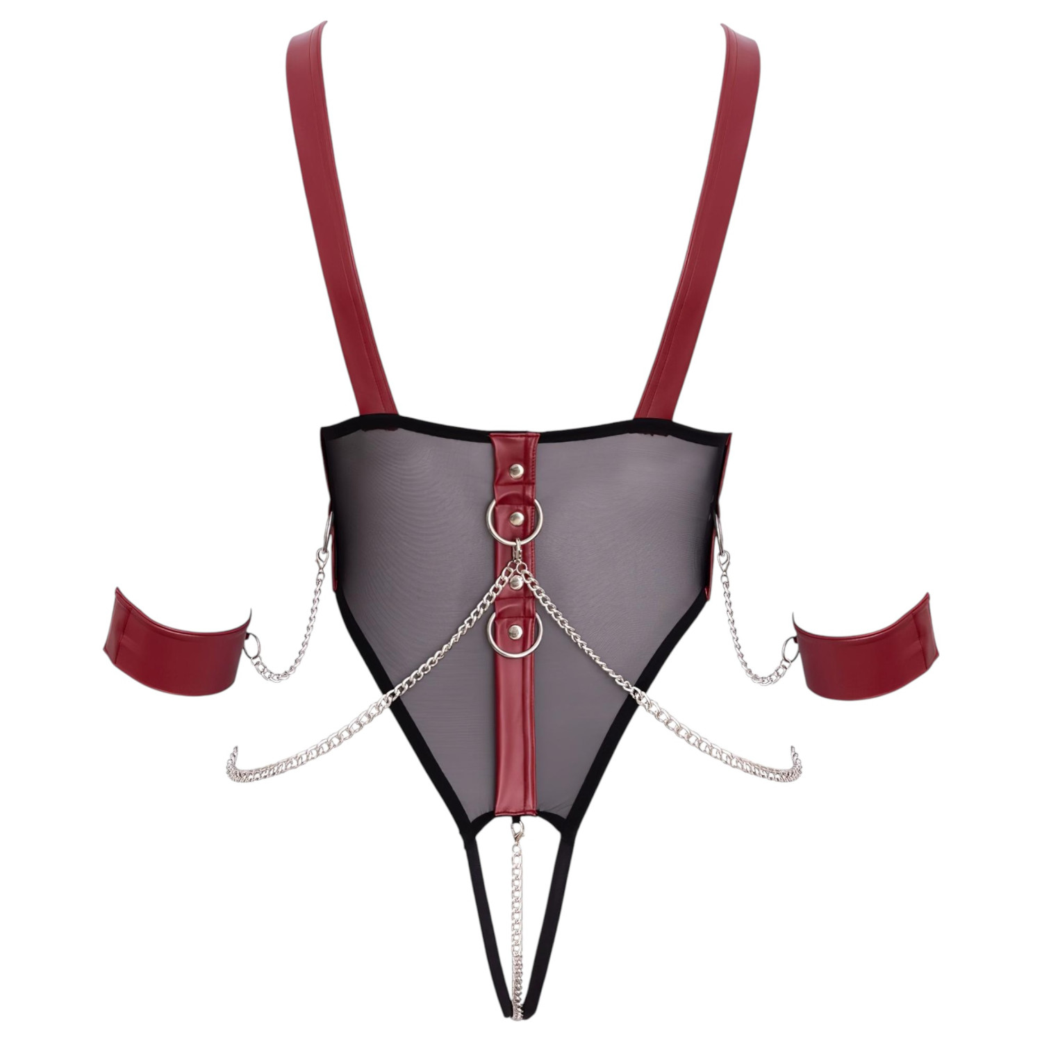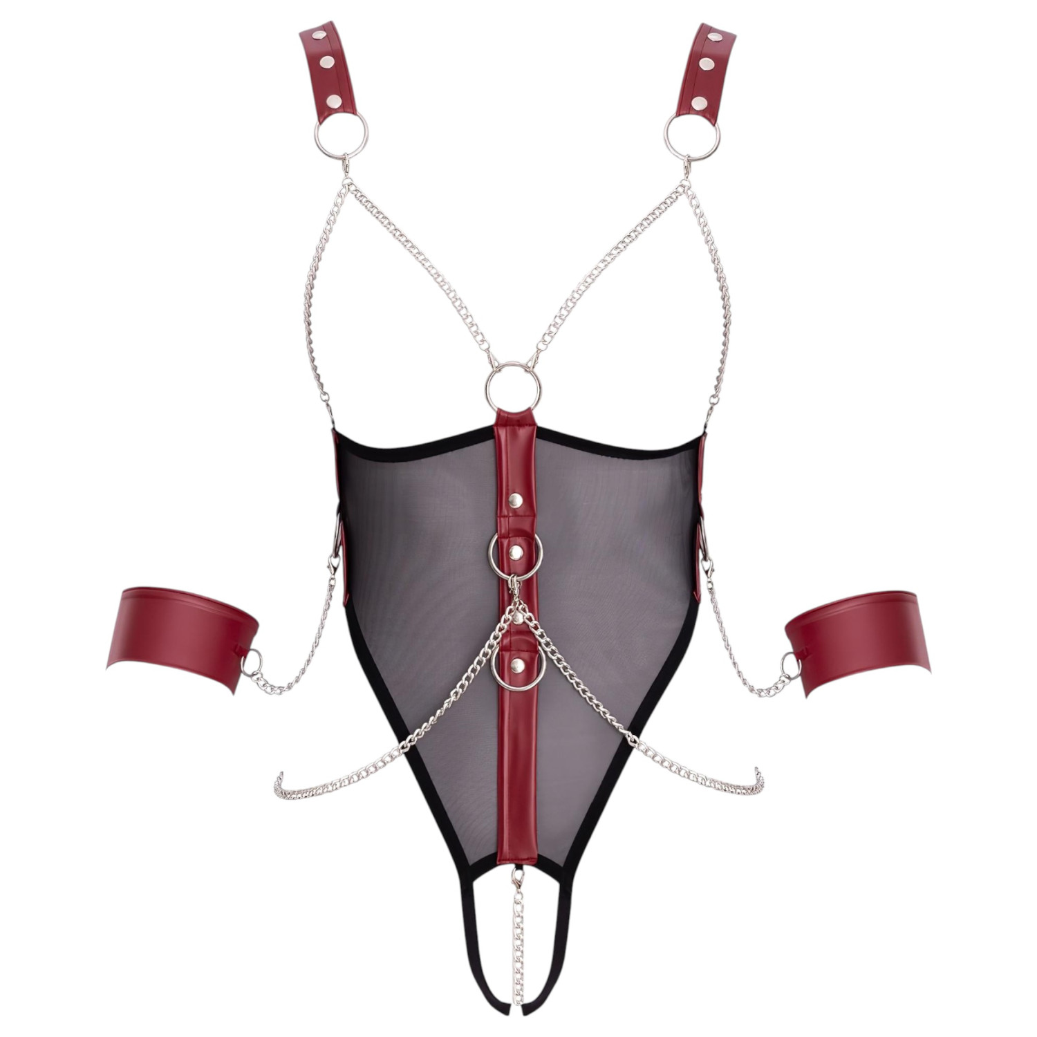 ¡Libera tu pasión con el body abierto con correas y cadena de Cottelli Bondage, acompañado de esposas suaves!