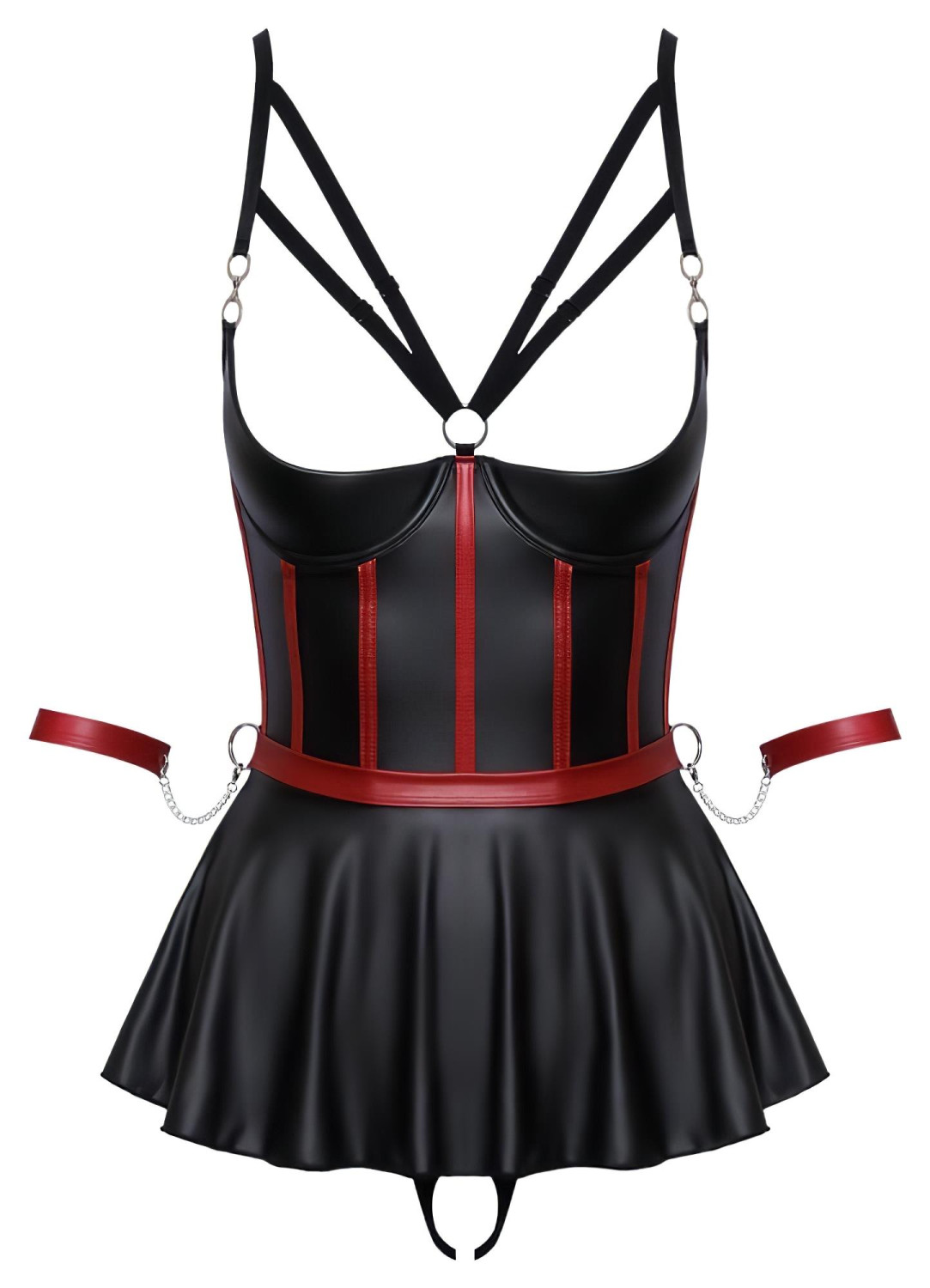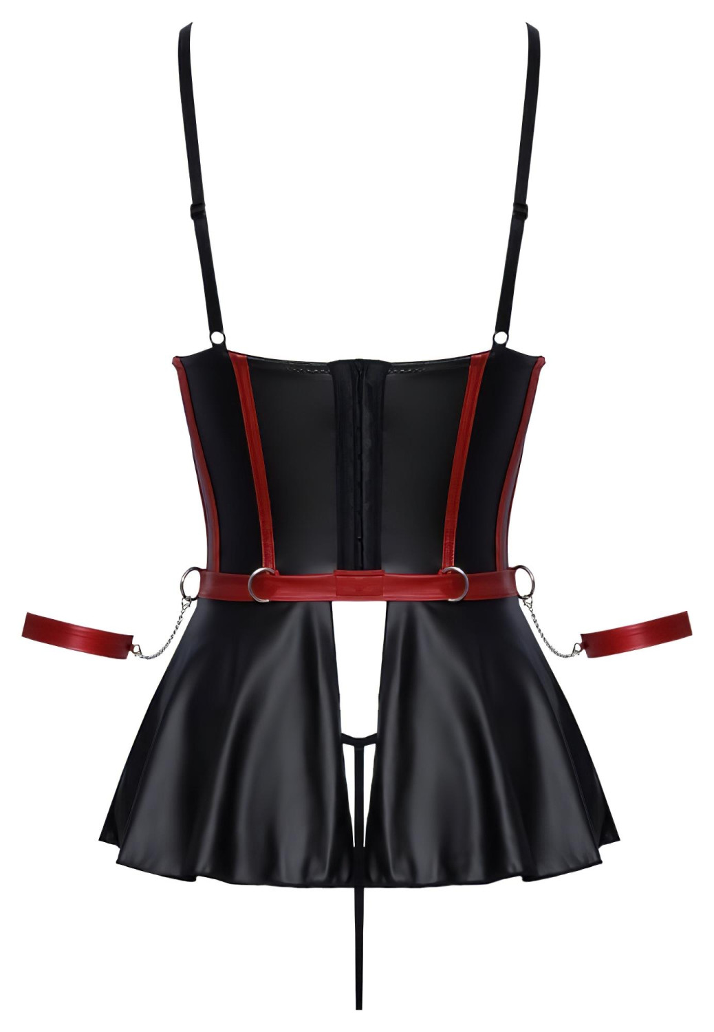 ¡Ideal para excitantes juegos de ataduras y bondage, este sujetador tipo malla con faldita combina el negro mate y el rojo en un diseño súper provocativo!