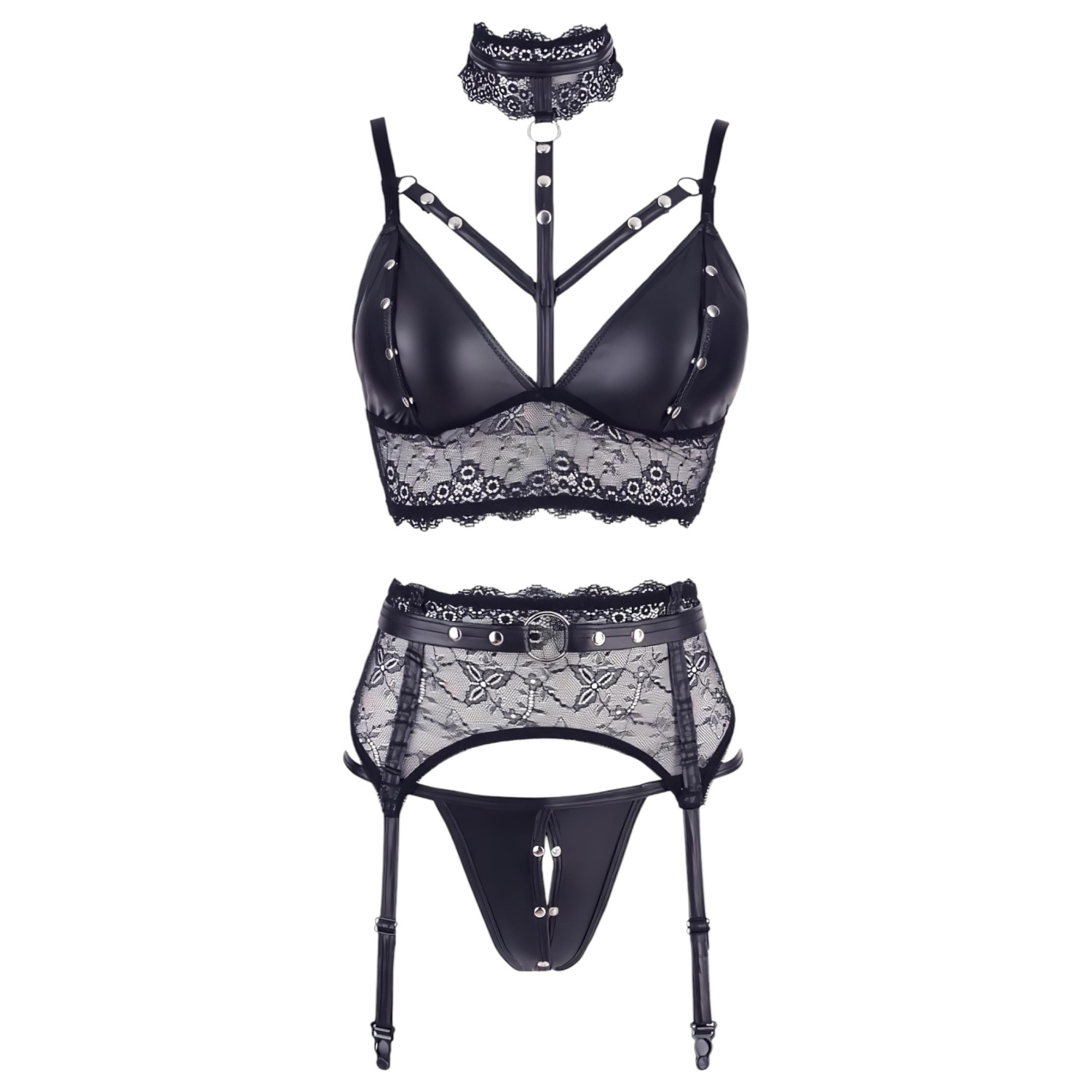 ¡Un set hecho con la combinación de tiras brillantes y suave encaje, decorado con tachuelas que hace que tu look sea realmente especial!