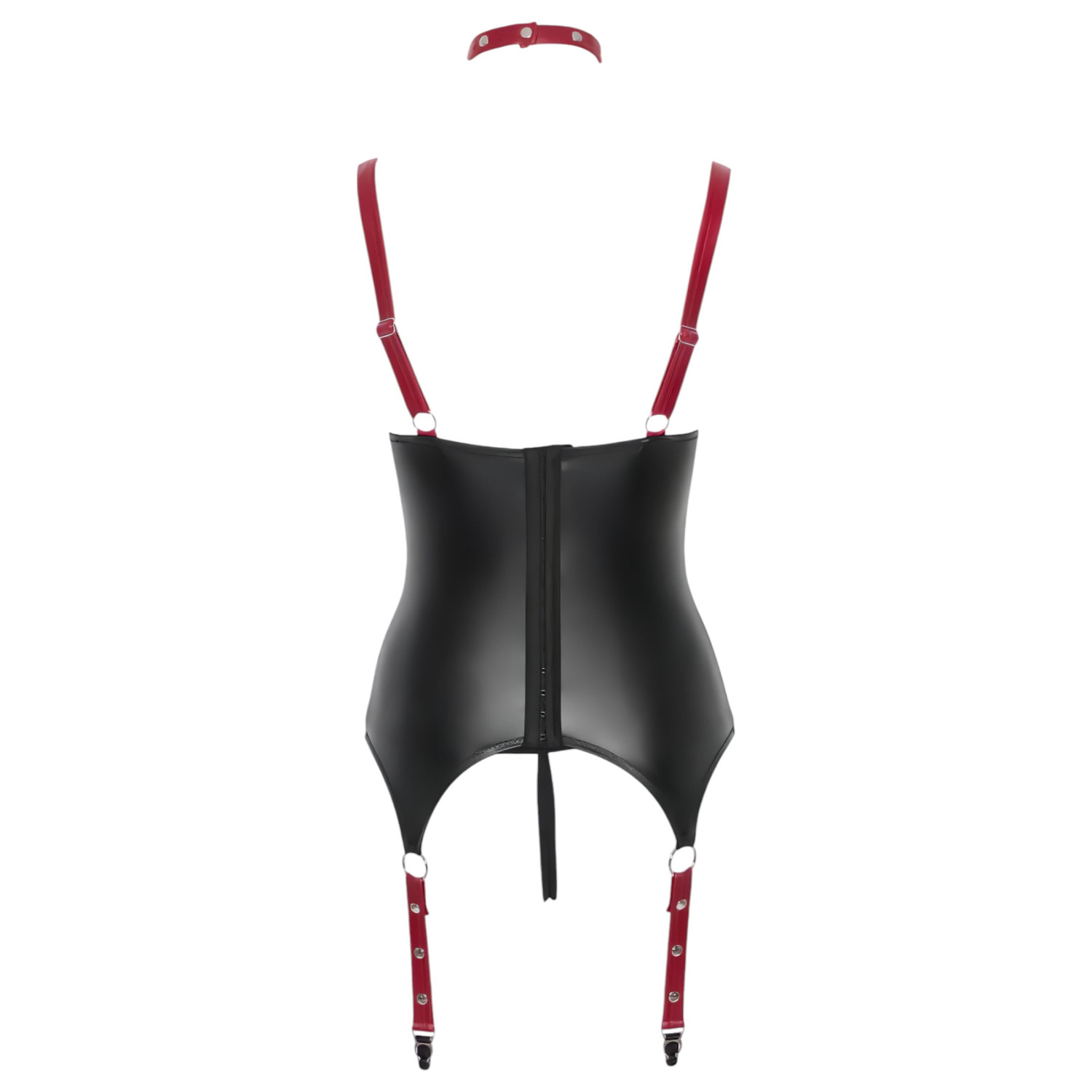 Atrevidos tirantes rojos, tela negra brillante y accesorios con tachuelas: un conjunto de lencería que logra el equilibrio perfecto entre seducción y dominio.
