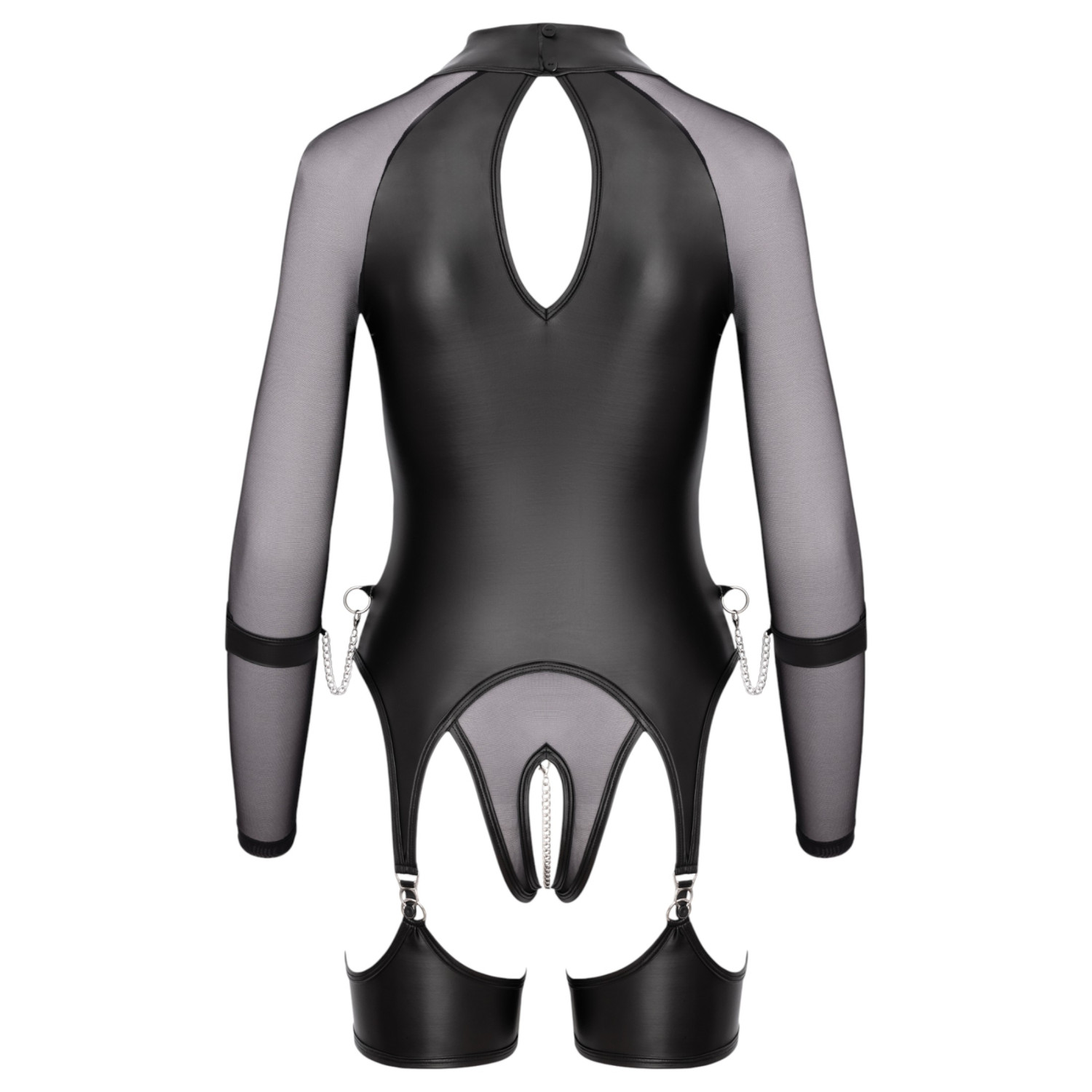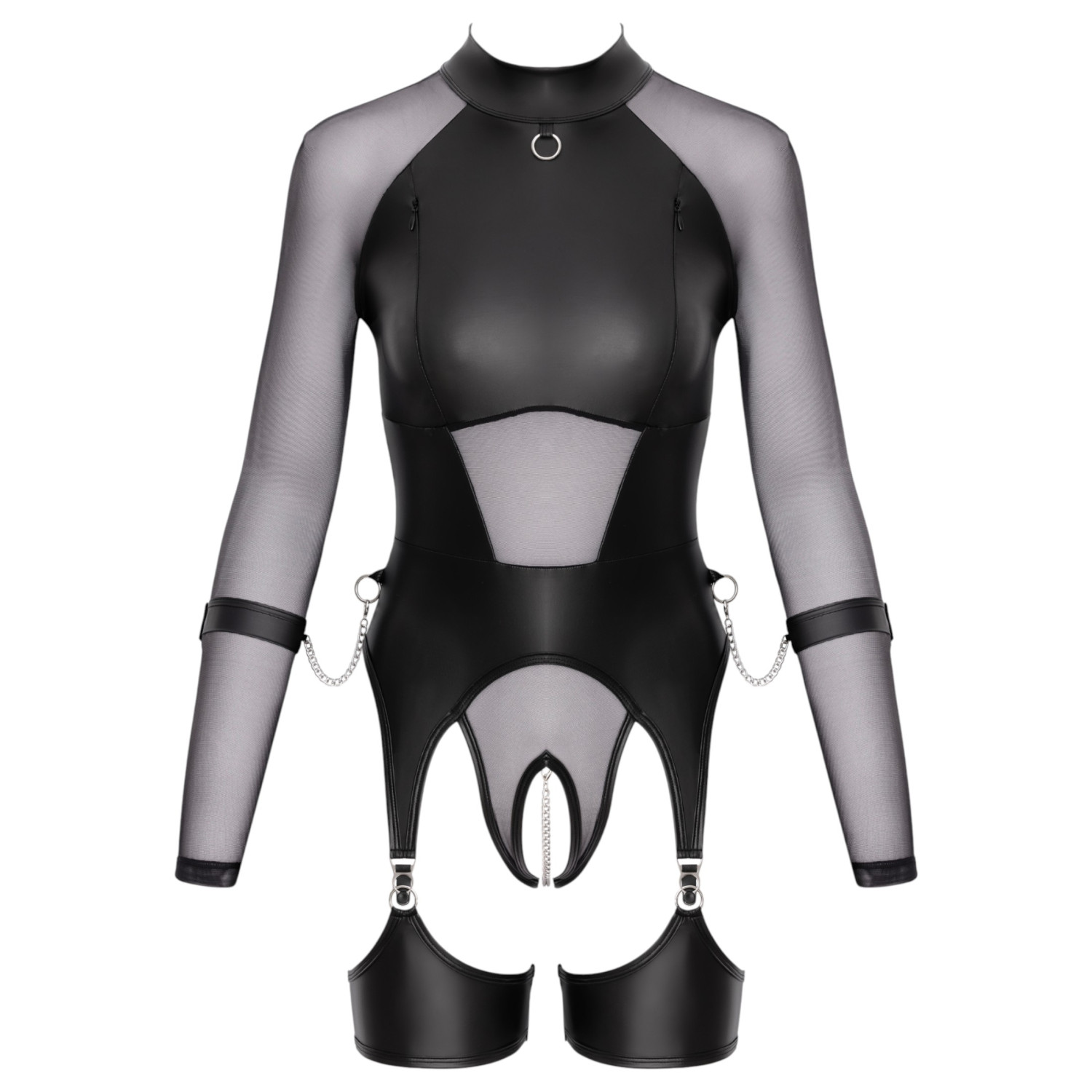 El conjunto transparente y brillante de Cottelli Bondage es la mezcla perfecta de erotismo atrevido y diseño sofisticado. El body ajustado de manga larga está hecho de una combinación de materiales transparentes y mates que son elegantes y provocativos. La cadena desmontable sobre la abertura íntima, los tirantes de muslo desmontables y las cremalleras ocultas en el pecho garantizan la emoción. Las esposas suaves incluidas se pueden conectar a los aros colocados en los lados del cuerpo, proporcionando una experiencia de juego realmente versátil e imaginativa.