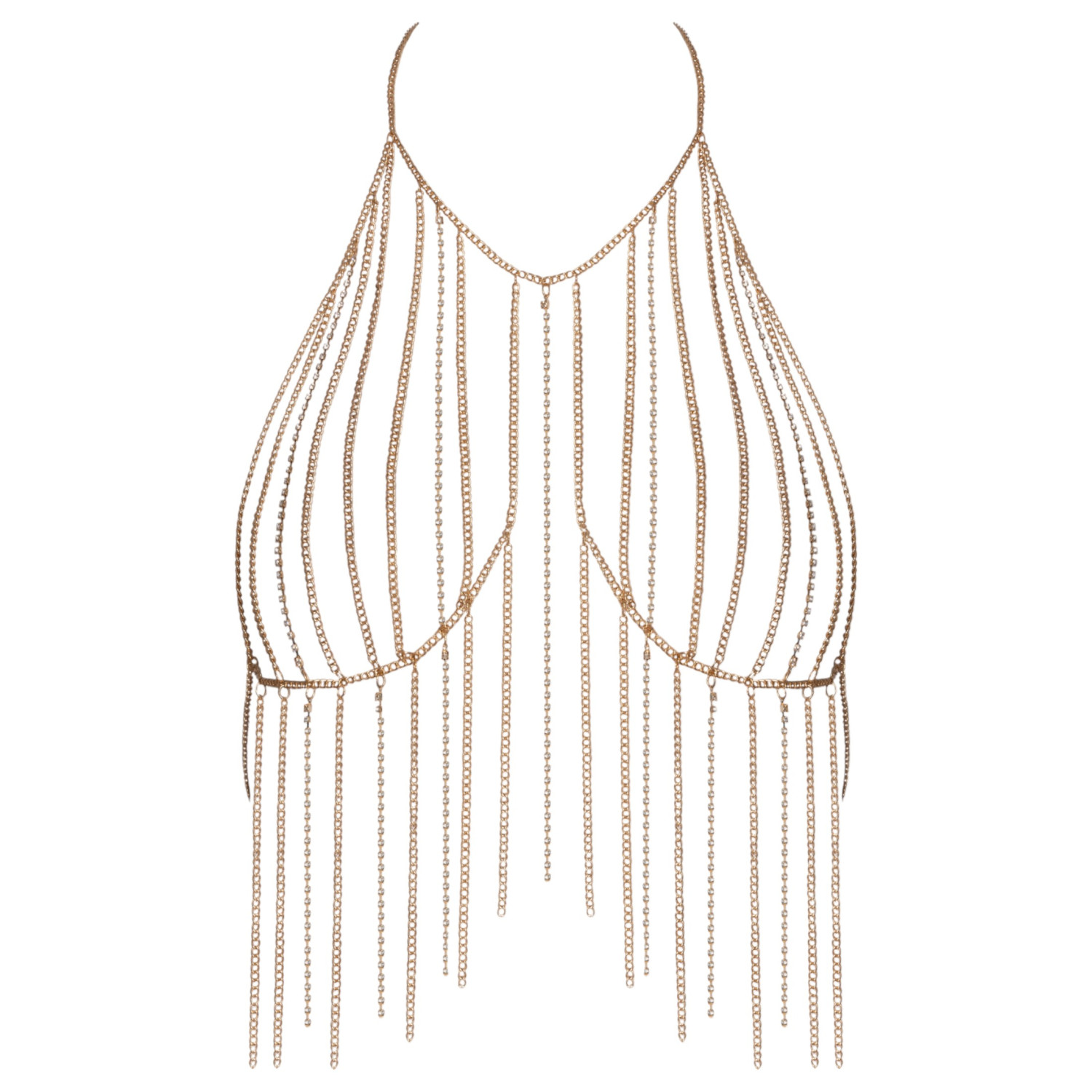 La cadena corporal ajustable Cottelli (oro) cubre tu parte superior del cuerpo como una verdadera joya y garantiza atraer todas las miradas, ya sea que la uses sobre la piel desnuda o sobre la ropa.