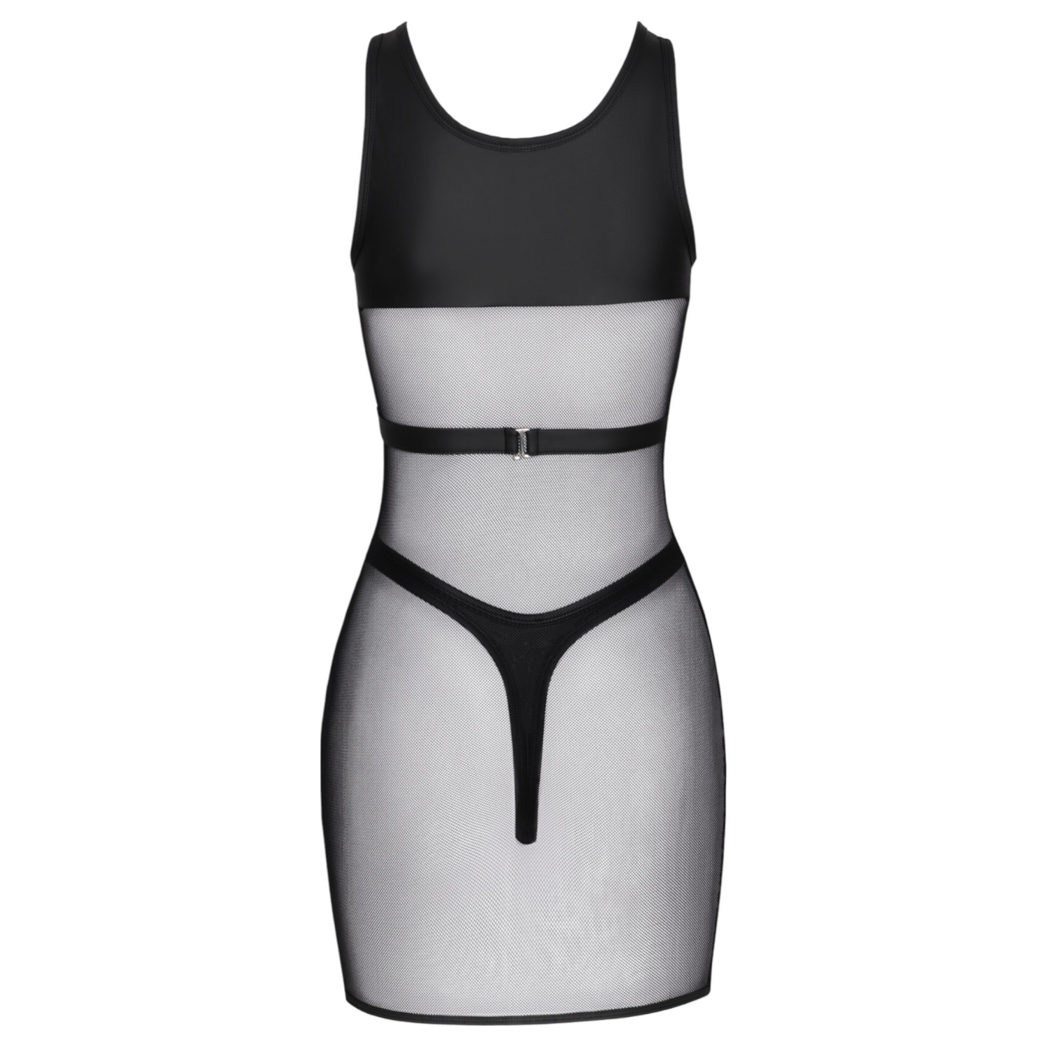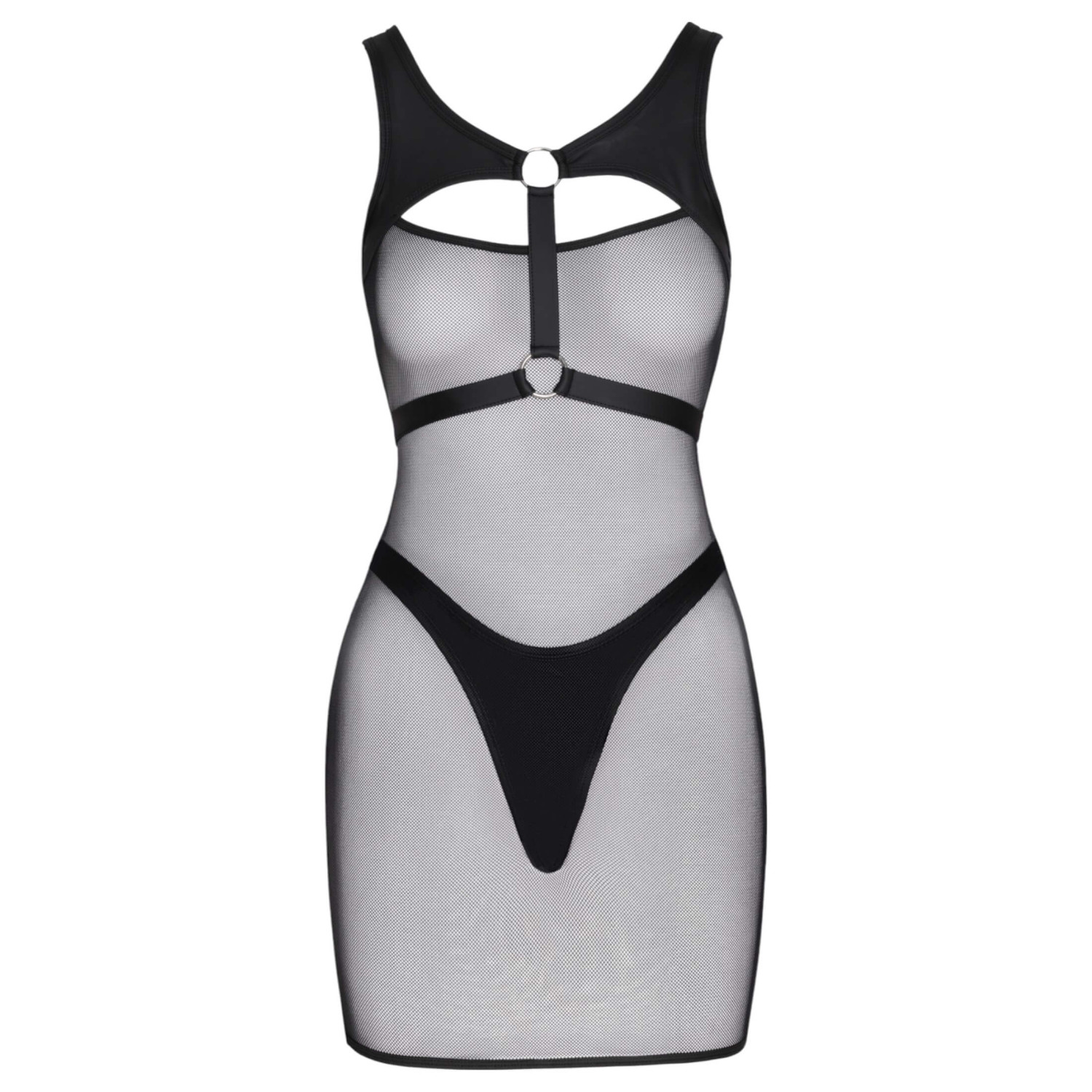 Este provocativo conjunto de vestido de malla y tanga es la elección perfecta si deseas algo realmente atrevido. El minivestido ceñido de malla transparente está adornado con anillas metálicas en el área del pecho y las tiras del sujetador de efecto brillante, proporcionando un efecto salvaje pero elegante. El tanga de corte alto de efecto brillante acentúa las caderas y el trasero. Los materiales elásticos aseguran comodidad durante toda la noche.