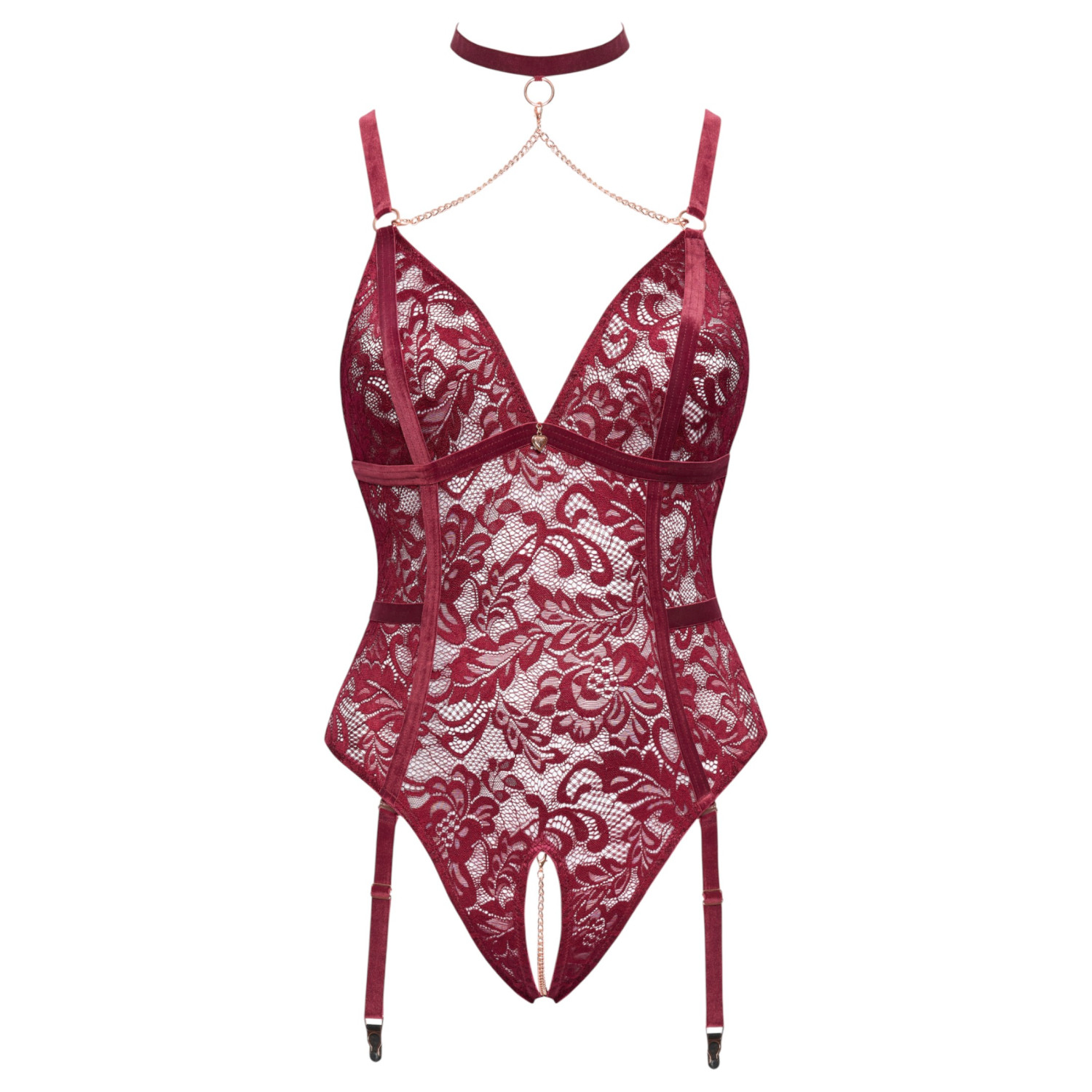 El body de encaje con cadenas Cottelli Curves es una elección ideal si buscas una prenda de lencería que garantice captar las miradas. El encaje rojo profundo, las tiras de terciopelo y los detalles metálicos en color oro rosa brindan una apariencia especial y lujosa. El elemento más emocionante del body es el cuello desmontable (choker), las cadenas removibles del escote y la cadena estimulante para el área íntima, que se ubica sobre el área totalmente abierta y es desmontable. El encaje elástico ofrece un uso cómodo y perfectamente ajustado, mientras las tiras ajustables permiten un ajuste personalizado al cuerpo. Las tiras para ligas y las cadenas son removibles, convirtiendo el body fácil de adaptar a un estilo atrevido o más recatado.