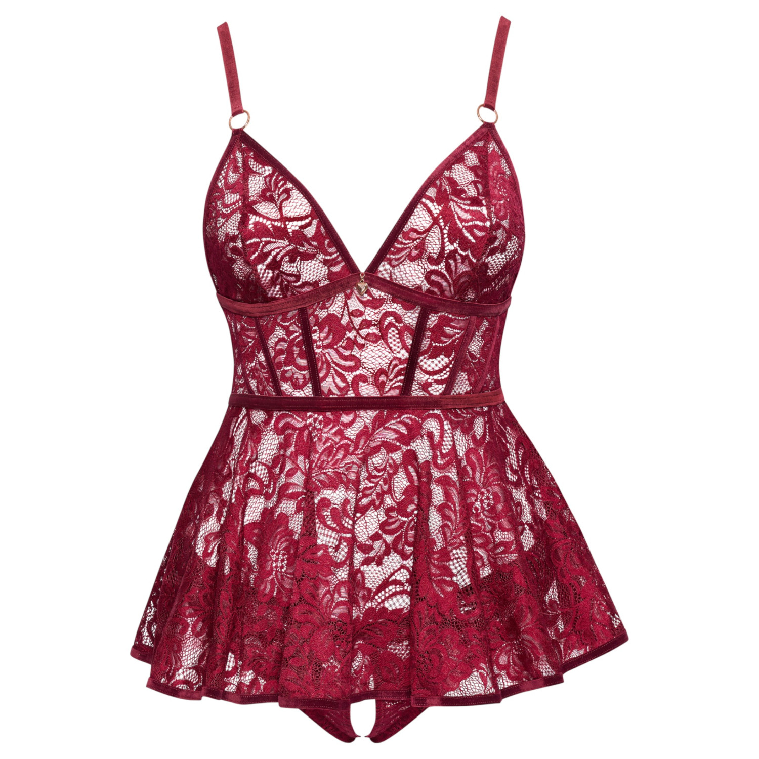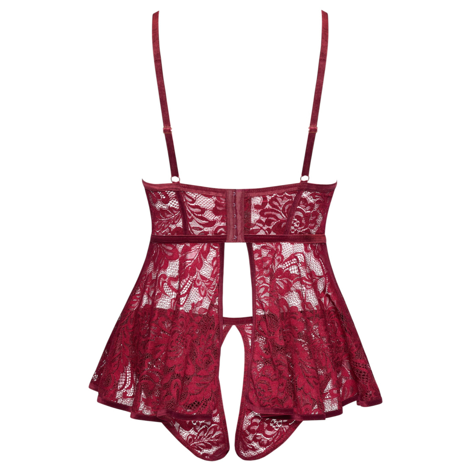 El conjunto de minivestido de encaje Cottelli Curves es la elección perfecta si deseas resaltar tu feminidad y quieres llevar ropa interior realmente seductora, pero cómoda. La combinación de encaje y material suave y elástico se adapta maravillosamente al cuerpo, mientras que la parte trasera abierta y la falda acampanada proporciona un aspecto elegante y erótico. Los tirantes aterciopelados en lugar de cadenas extraíbles y los adornos en oro rosa aportan un aspecto exclusivo. El tanga abierto a juego hace que la seducción sea perfecta.