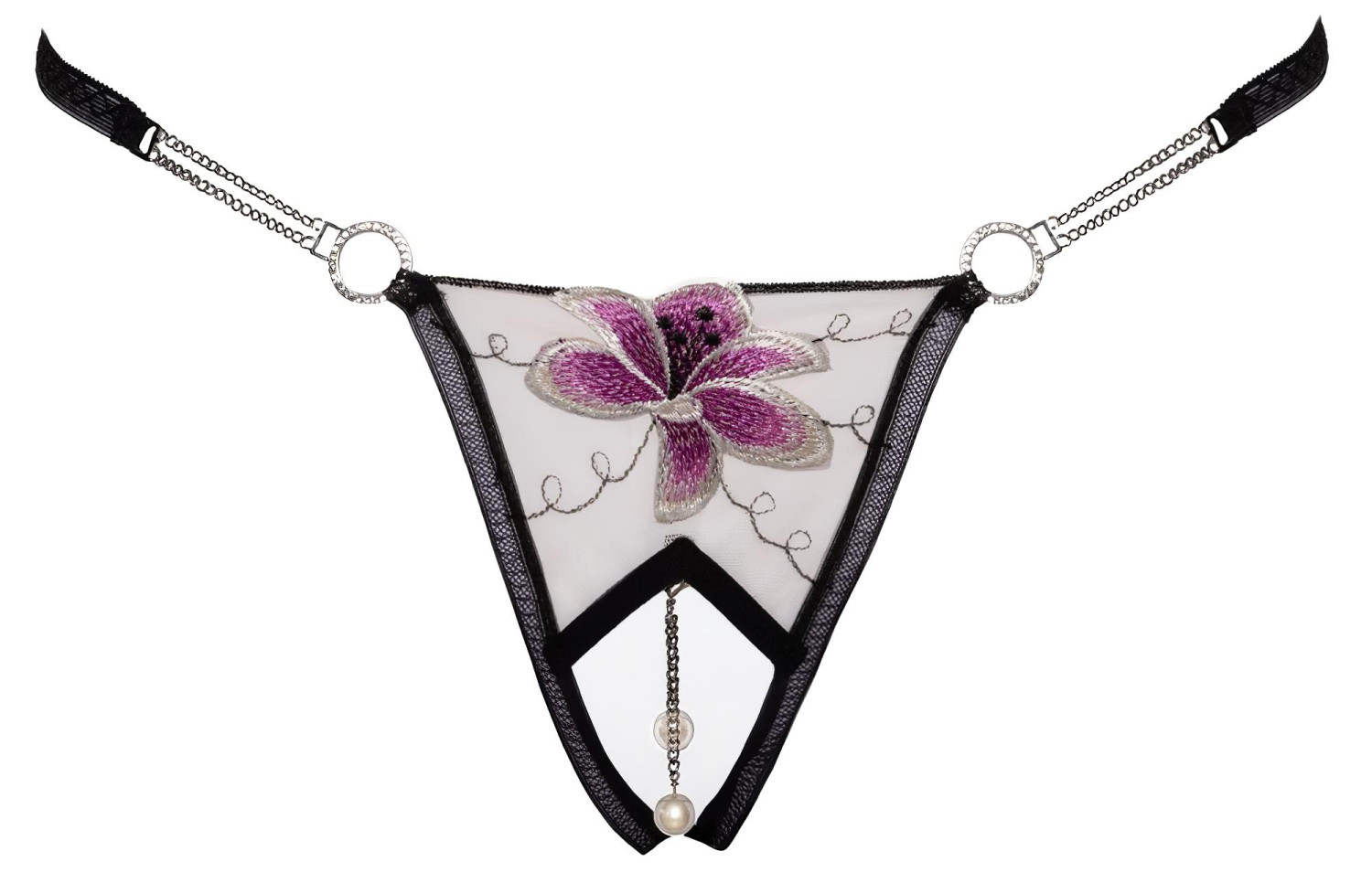• 1 tanga de red translúcida con bordado de lirios y cadenas de perlas desmontables.