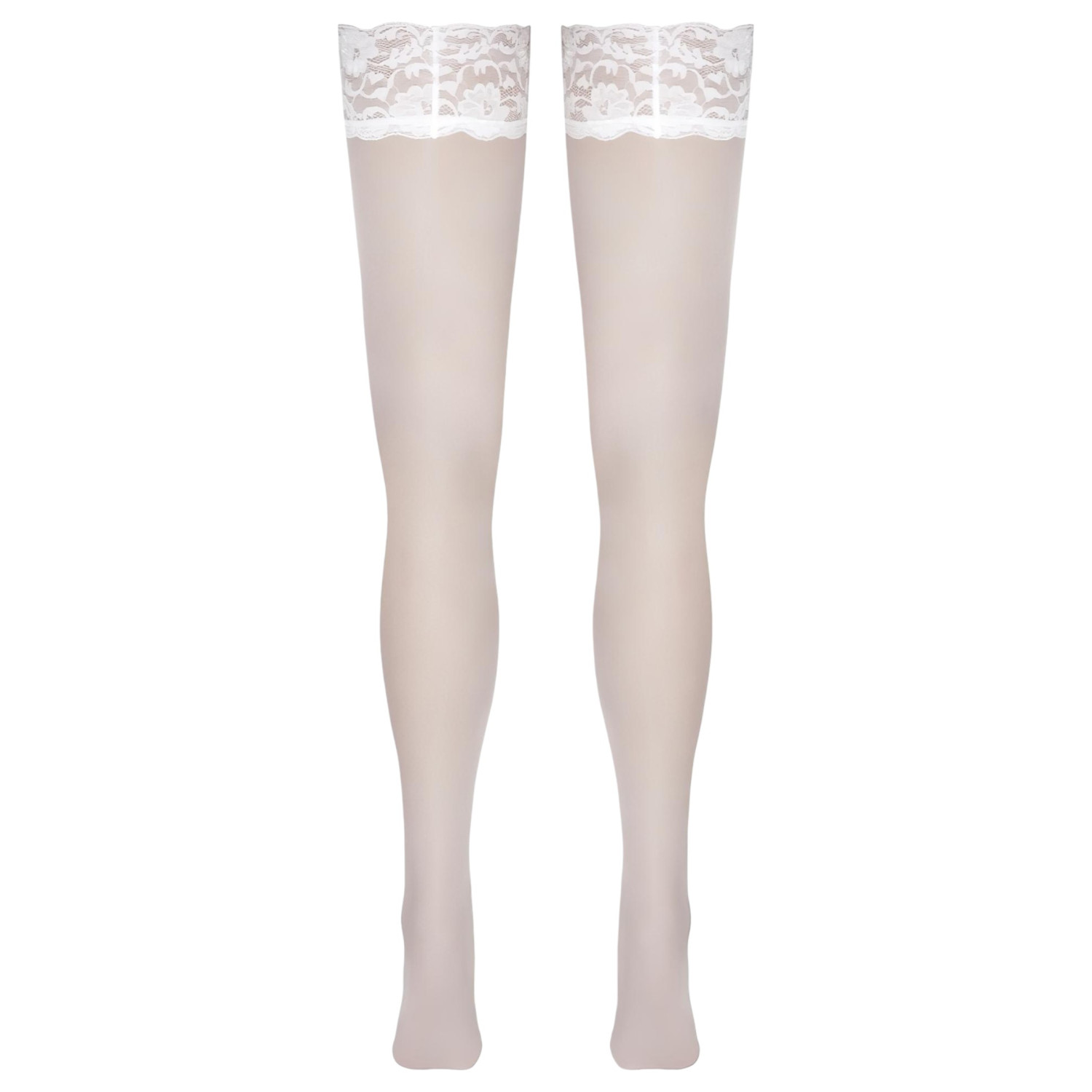 • 1 par de medias blancas hasta el muslo, con encaje de 9 cm y refuerzo de silicona