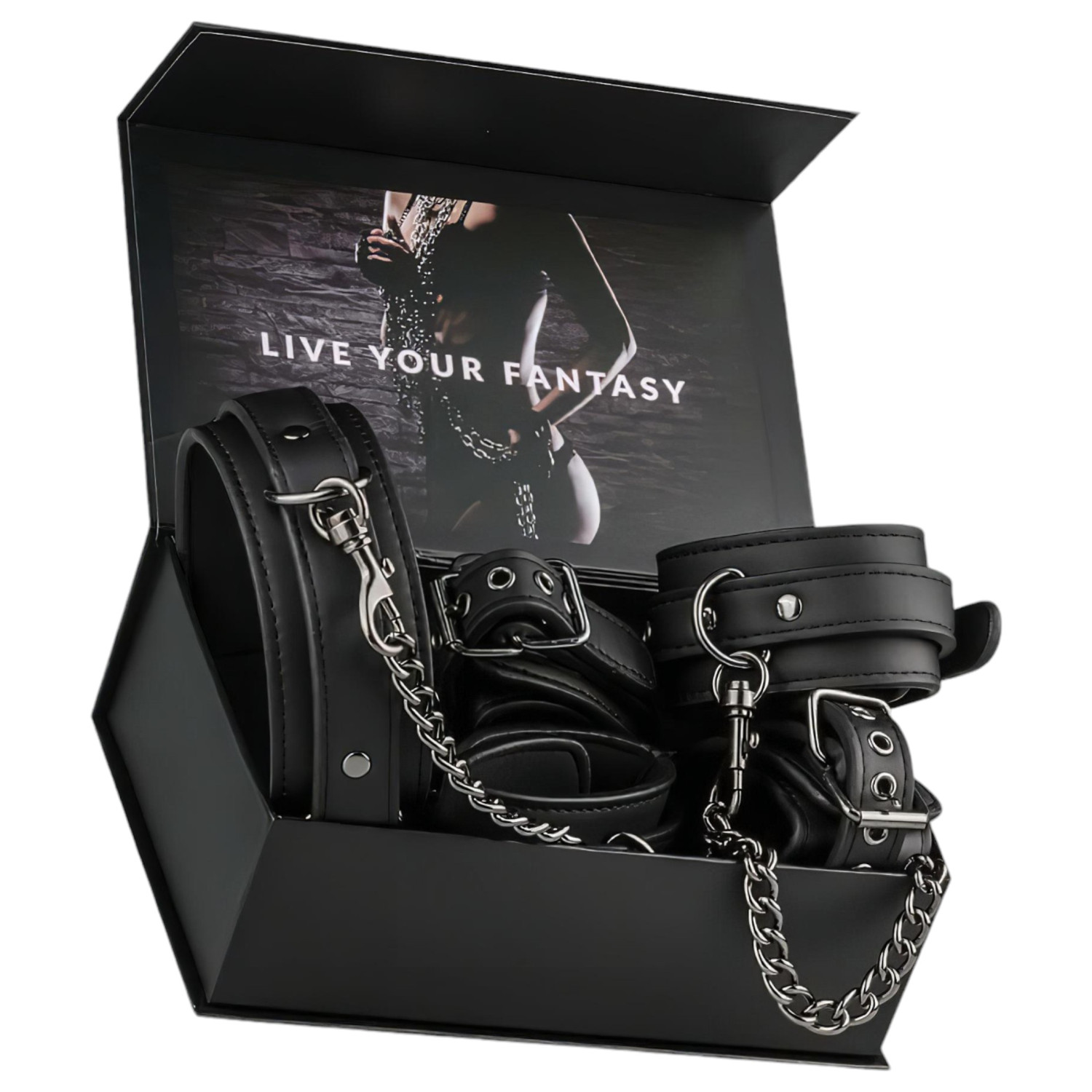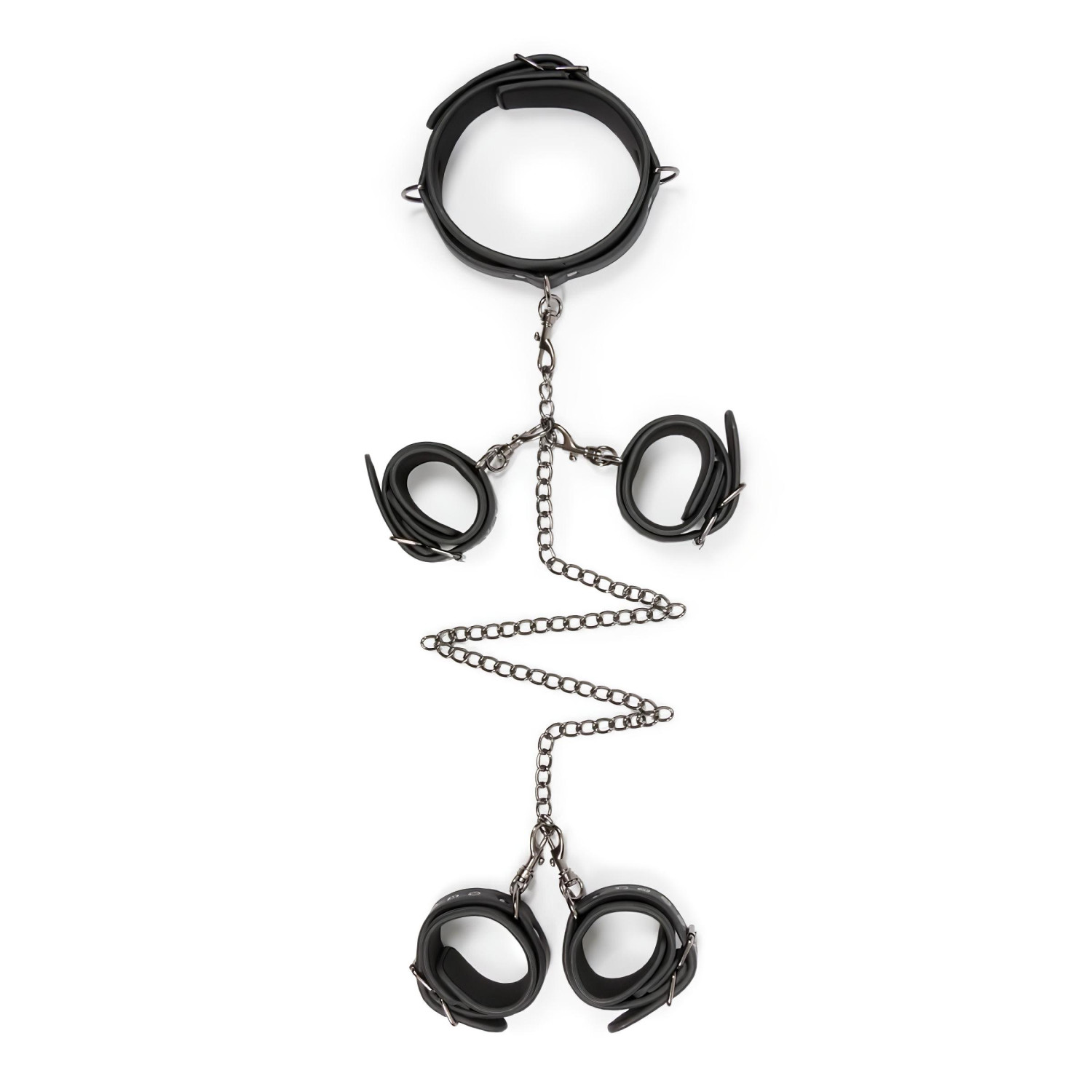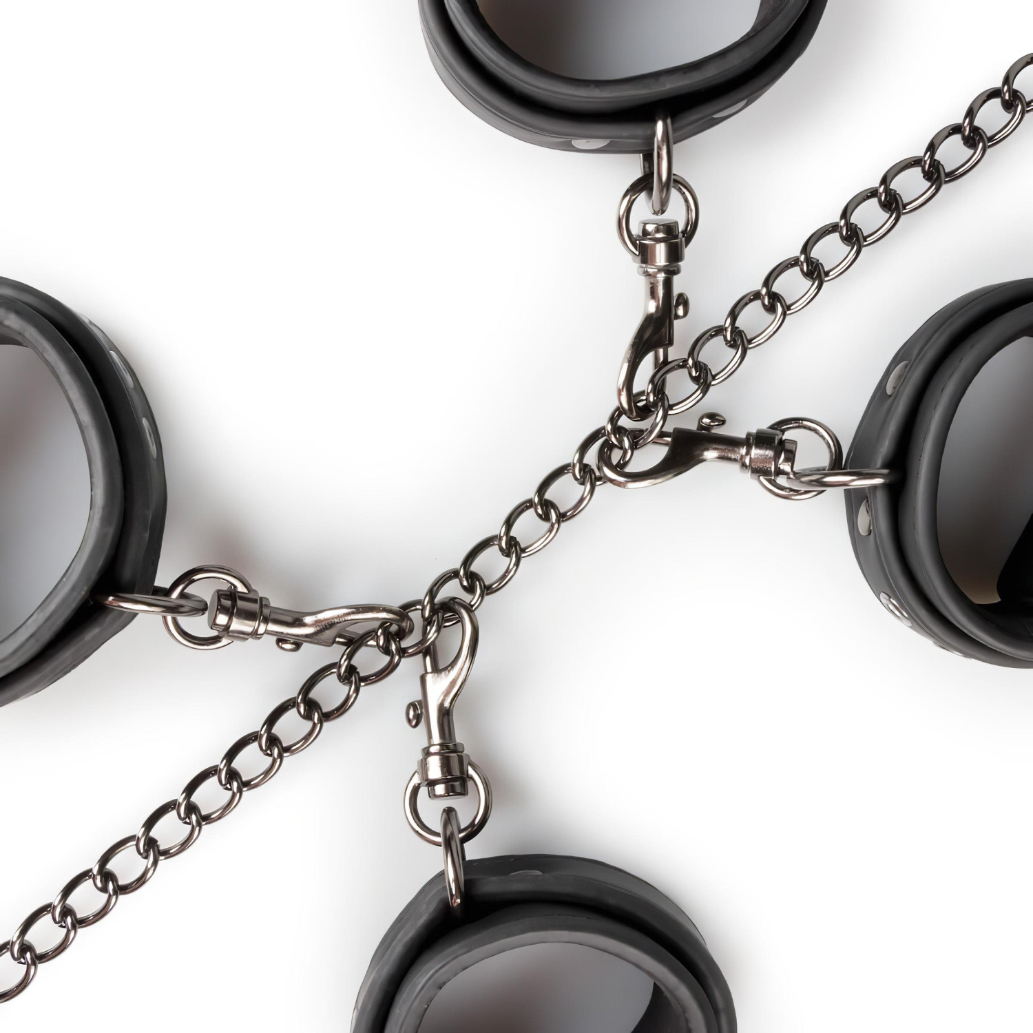 • Incluye esposas para muñecas y tobillos, además de un collar, que puedes unir entre sí con la cadena