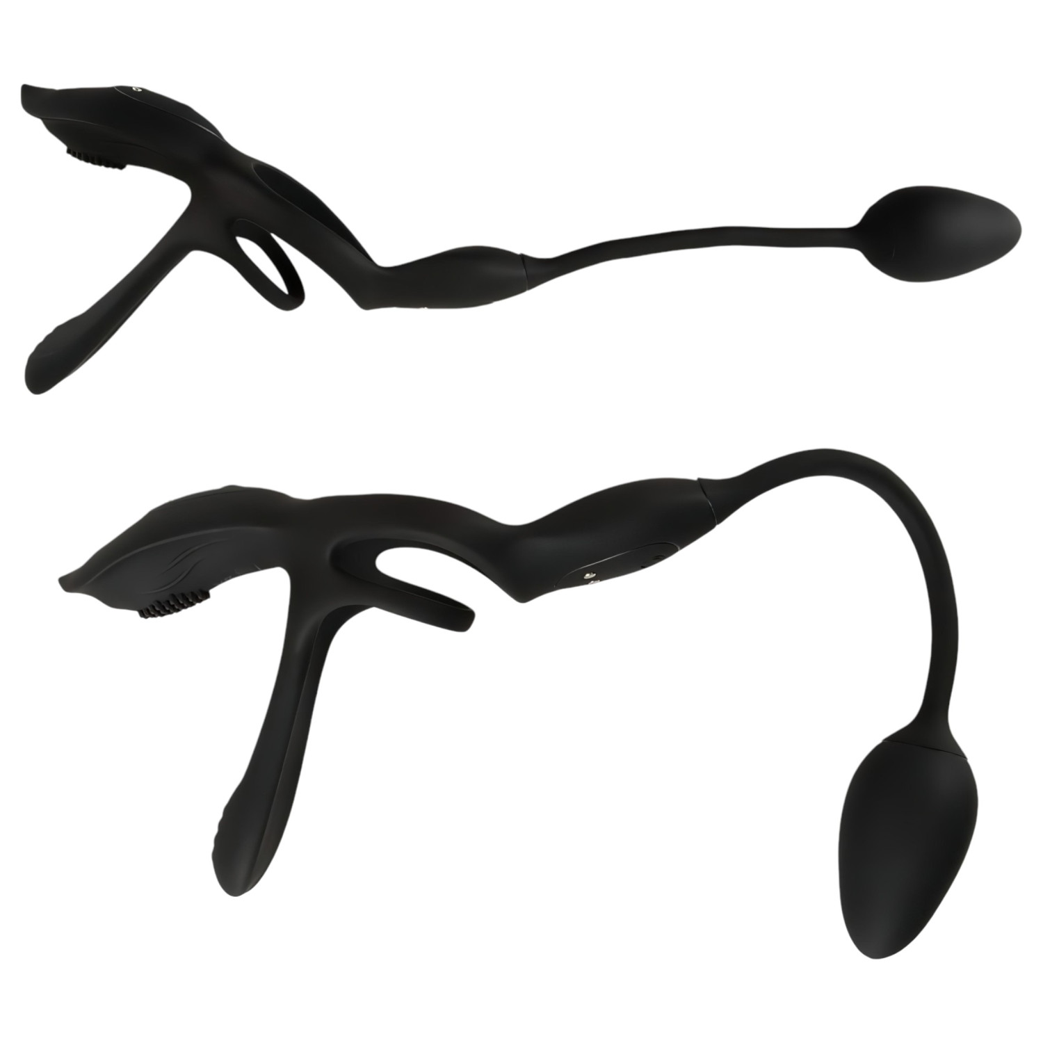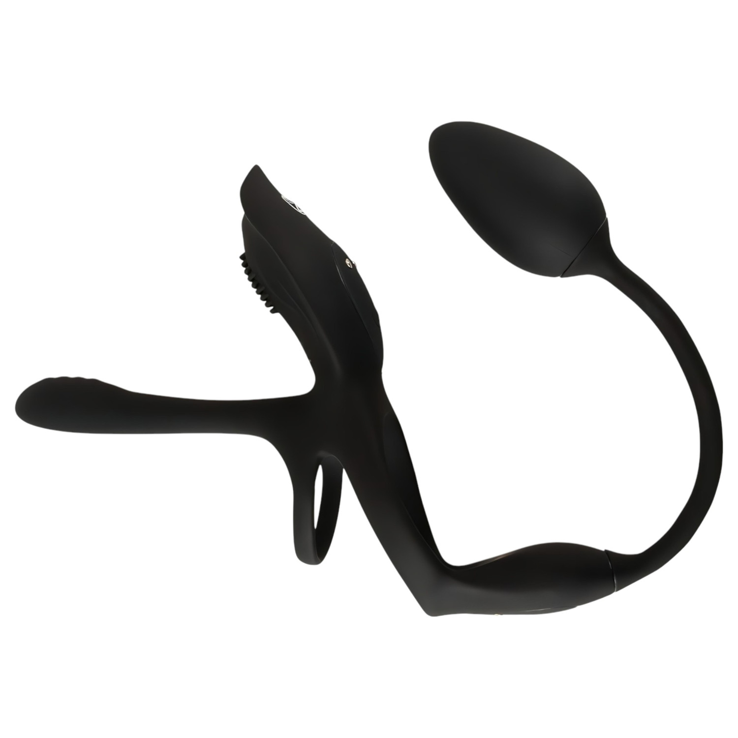 Ponte los anillos flexibles para pene y testículos de manera que el vibrador plano para parejas quede sobre el pene. Así ganarás grosor y los anillos ajustados te ayudarán a mantener erecciones más largas. El vibrador para clítoris estimula suavemente durante el sexo y el dildo anal vibrador se usa para estimulación anal.
