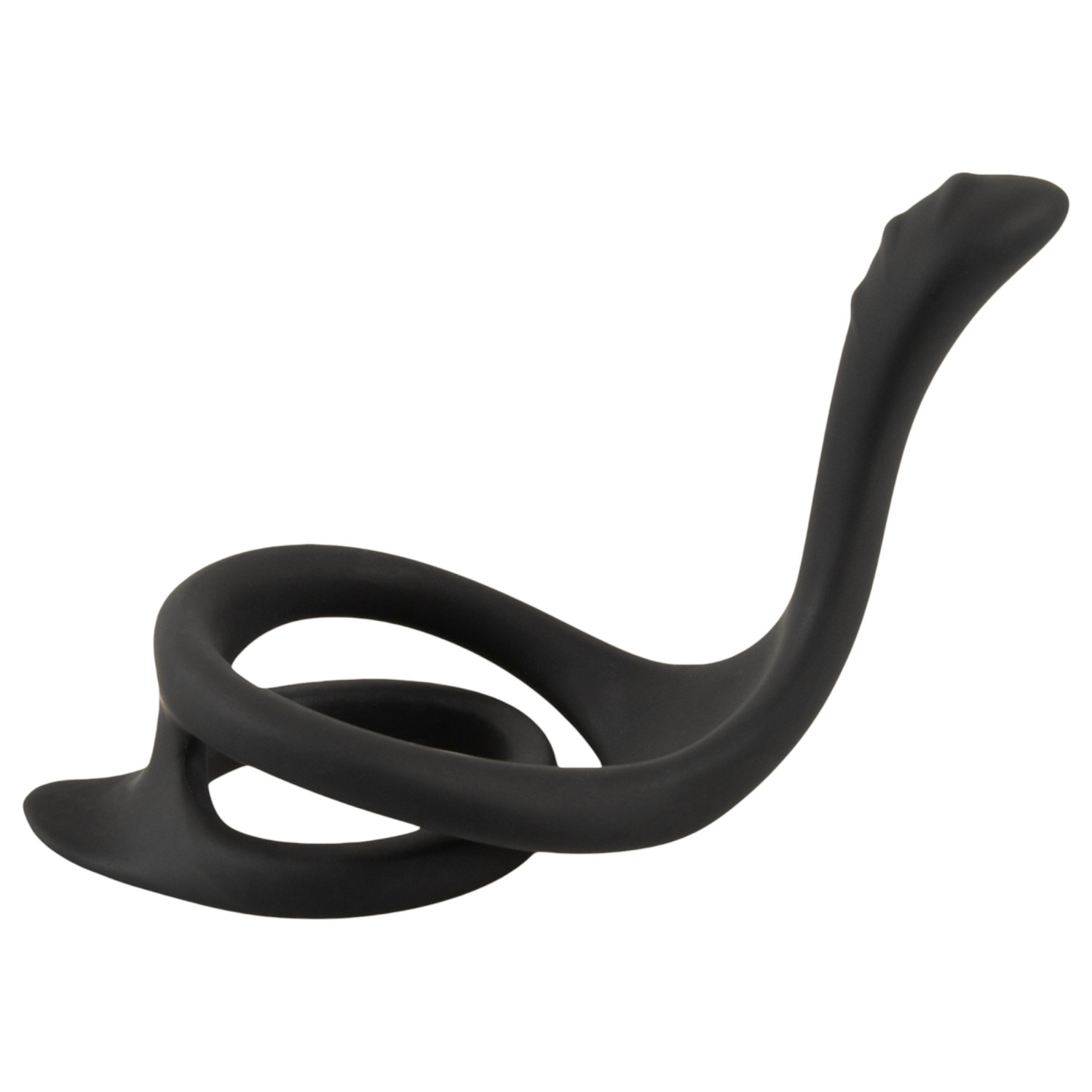 Coloca el anillo del pene en la base del mismo y el anillo de testículos en la base del escroto. Asegúrate de que el estimulador del perineo esté apuntando hacia adelante. Usar con agua o lubricante a base de agua para una colocación más fácil y cómoda.