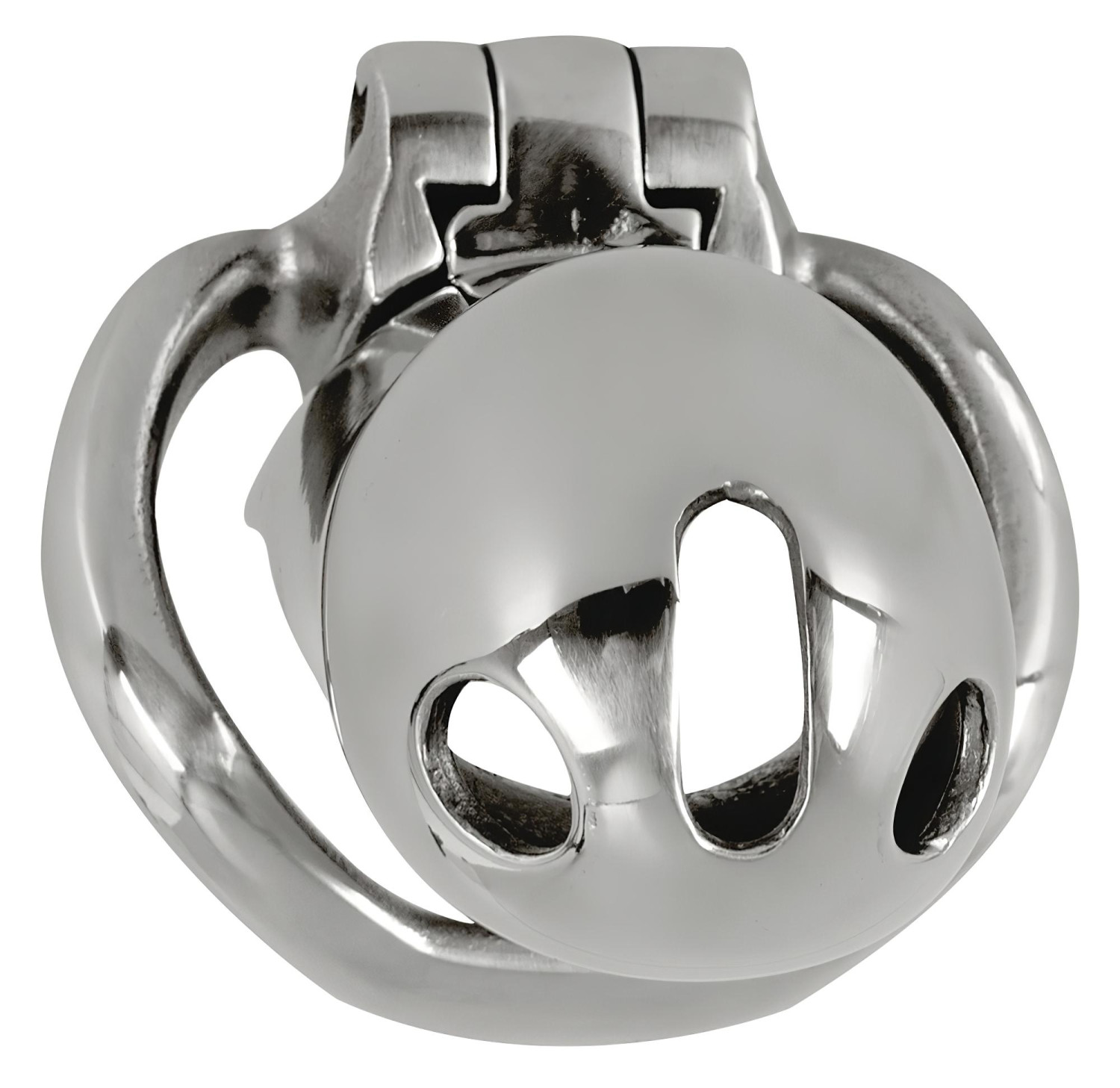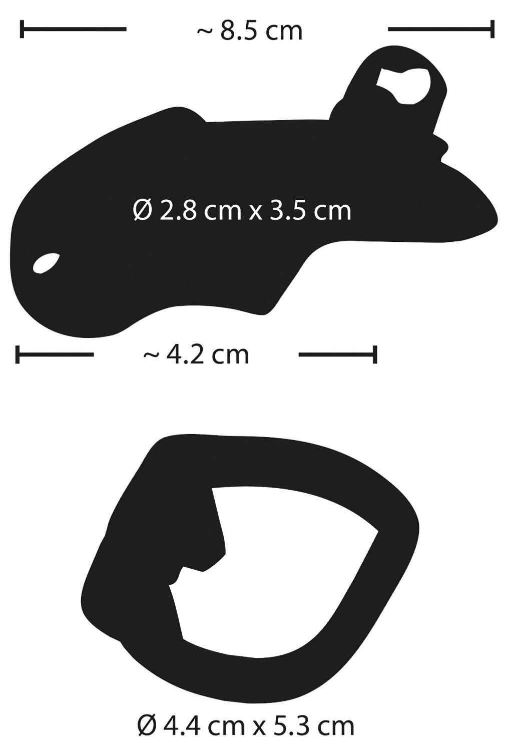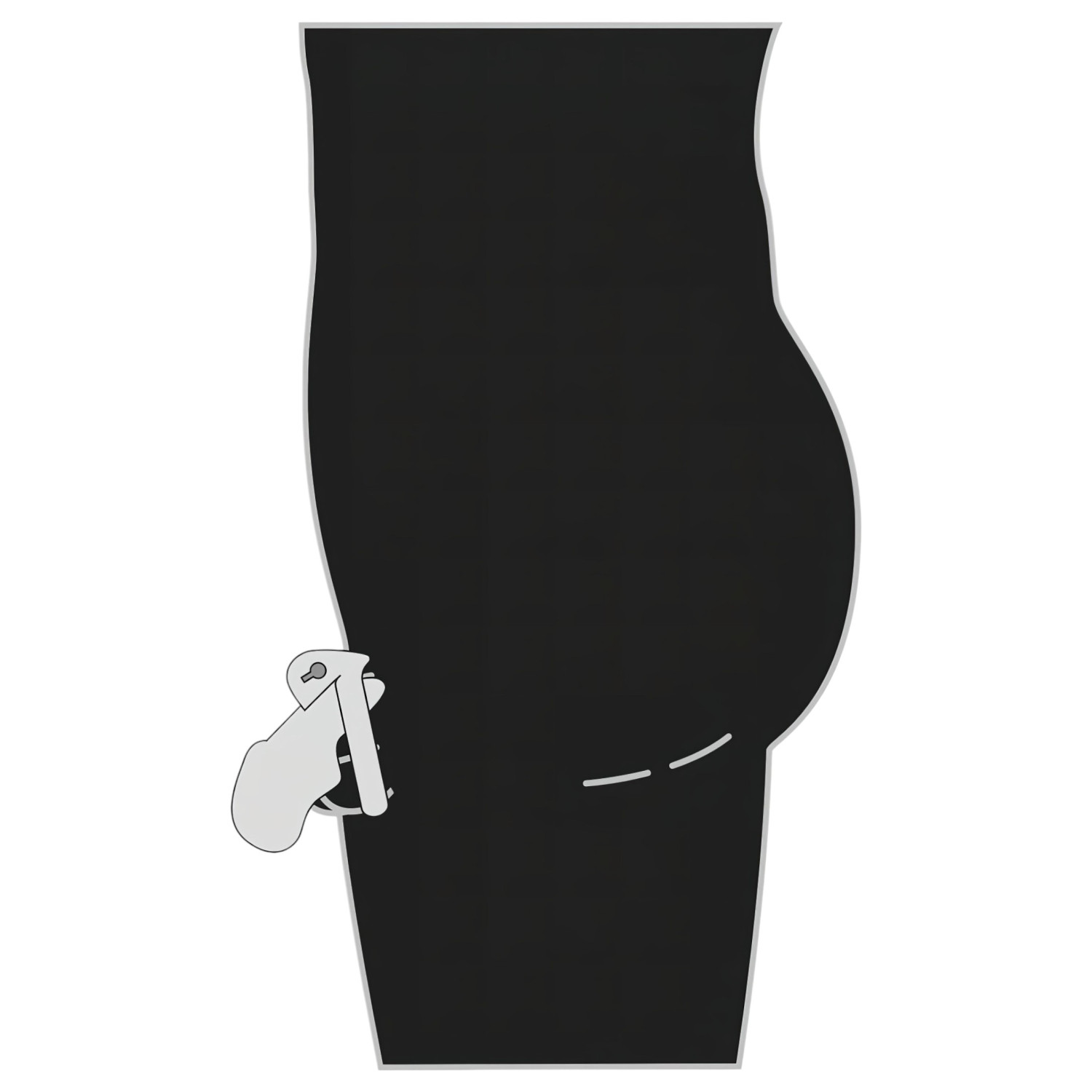 • Abre el candado y desliza el anillo de metal hasta la base del pene, incluyendo los testículos. Así el pene encajará perfectamente (en estado flácido) en la jaula.