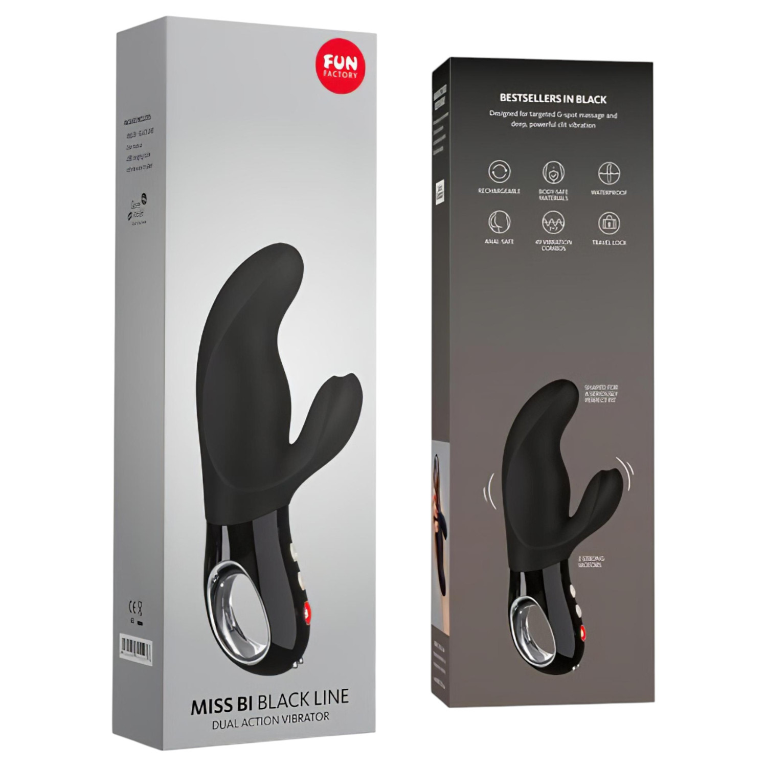 El Fun Factory Miss Bi - Vibrador para punto G (negro) es un vibrador premium tipo conejo, diseñado para estimular simultáneamente el punto G y el clítoris. Su eje más corto y curvado se centra específicamente en el punto G, mientras que el brazo flexible envuelve suavemente el clítoris. Dos motores separados proporcionan vibraciones intensas y profundas. La forma se ensancha "donde importa", ofreciendo una sensación de plenitud extremadamente satisfactoria a pesar de su tamaño compacto. Recargable, resistente al agua, silencioso y discreto, es una elección ideal para aquellos que buscan una experiencia prémium.