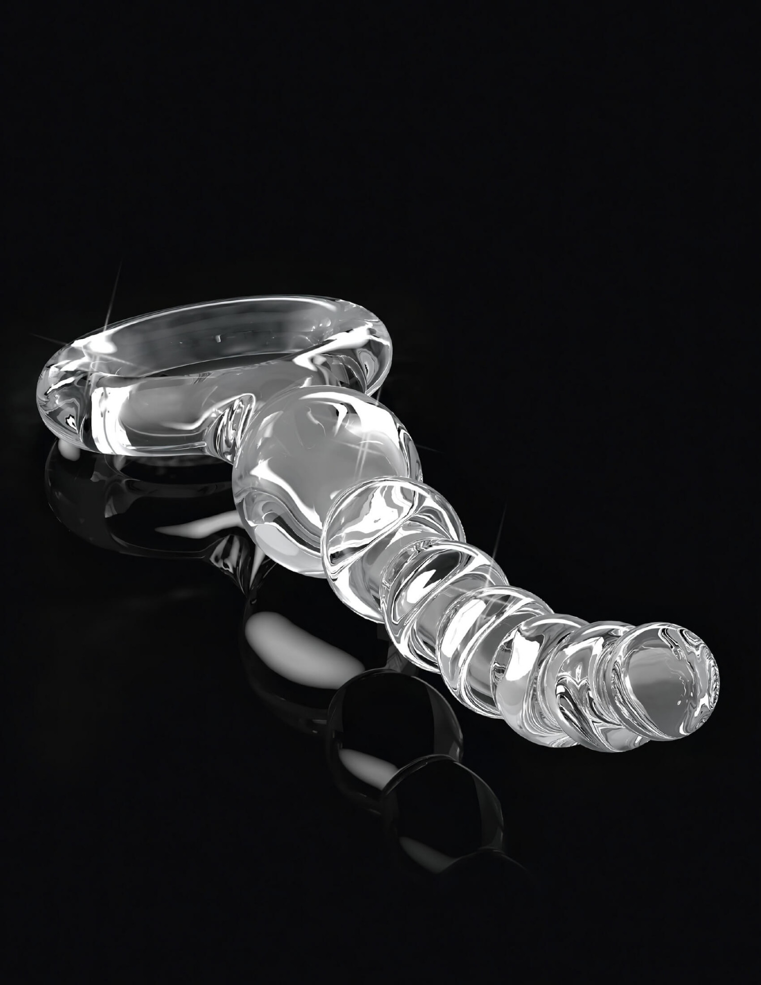 Un elegante dildo de vidrio hecho a mano con superficie de esferas, que es tanto un elemento de diseño como un juguete erótico funcional.