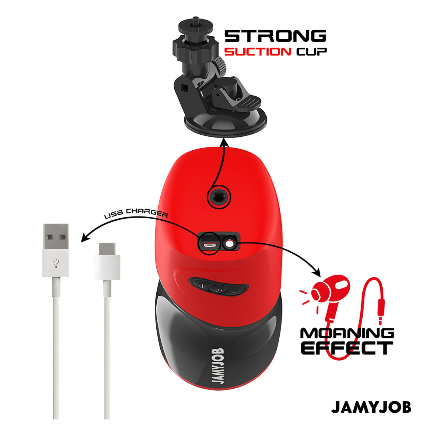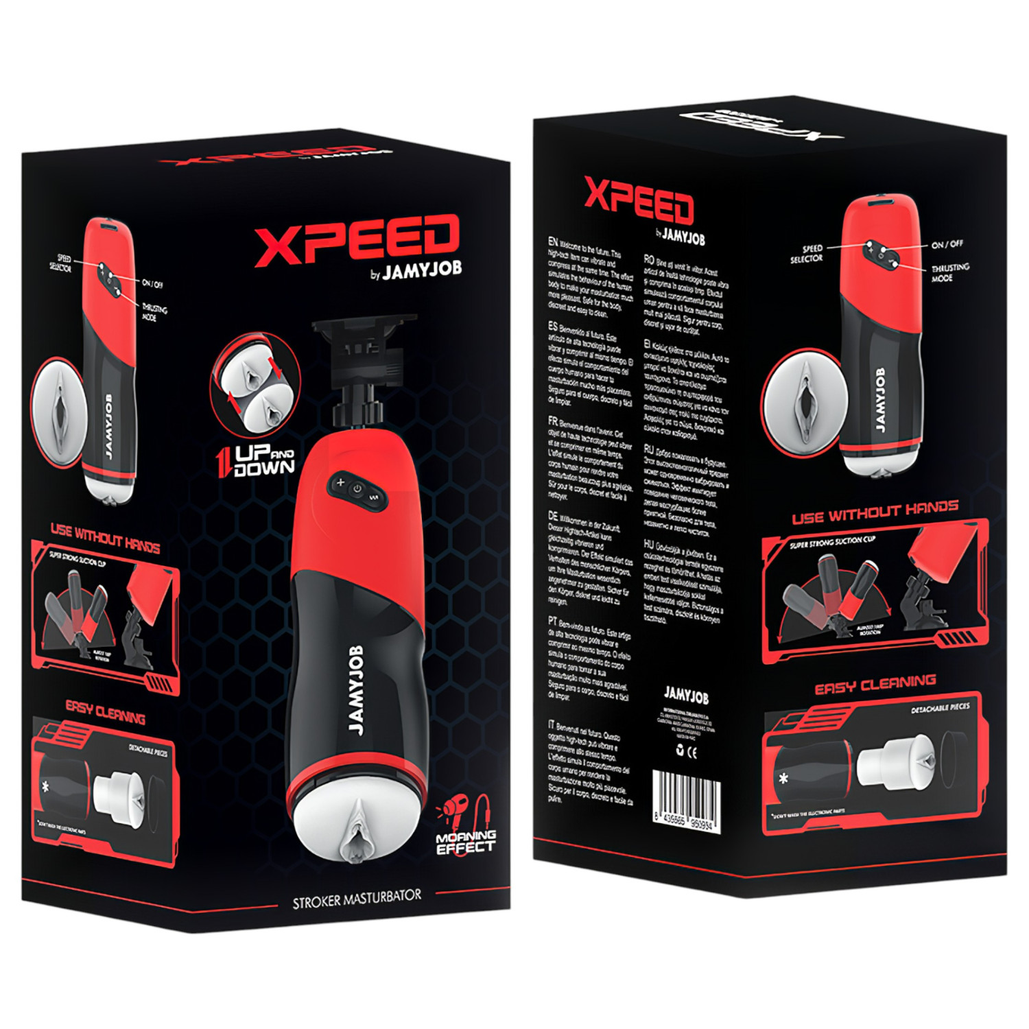 El JamyJob XPEED es uno de los masturbadores masculinos más innovadores del mercado, que combina movimientos realistas, empujes potentes y efectos de sonido realistas en un diseño elegante negro y rojo. El suave y translúcido inserto de silicona médica se ajusta cómodamente, mientras que los 5 ritmos de empuje diferentes y la intensidad ajustable te dan el control total. El motor recargable por USB asegura un rendimiento duradero y el diseño impermeable permite una limpieza cómoda y uso en el baño.