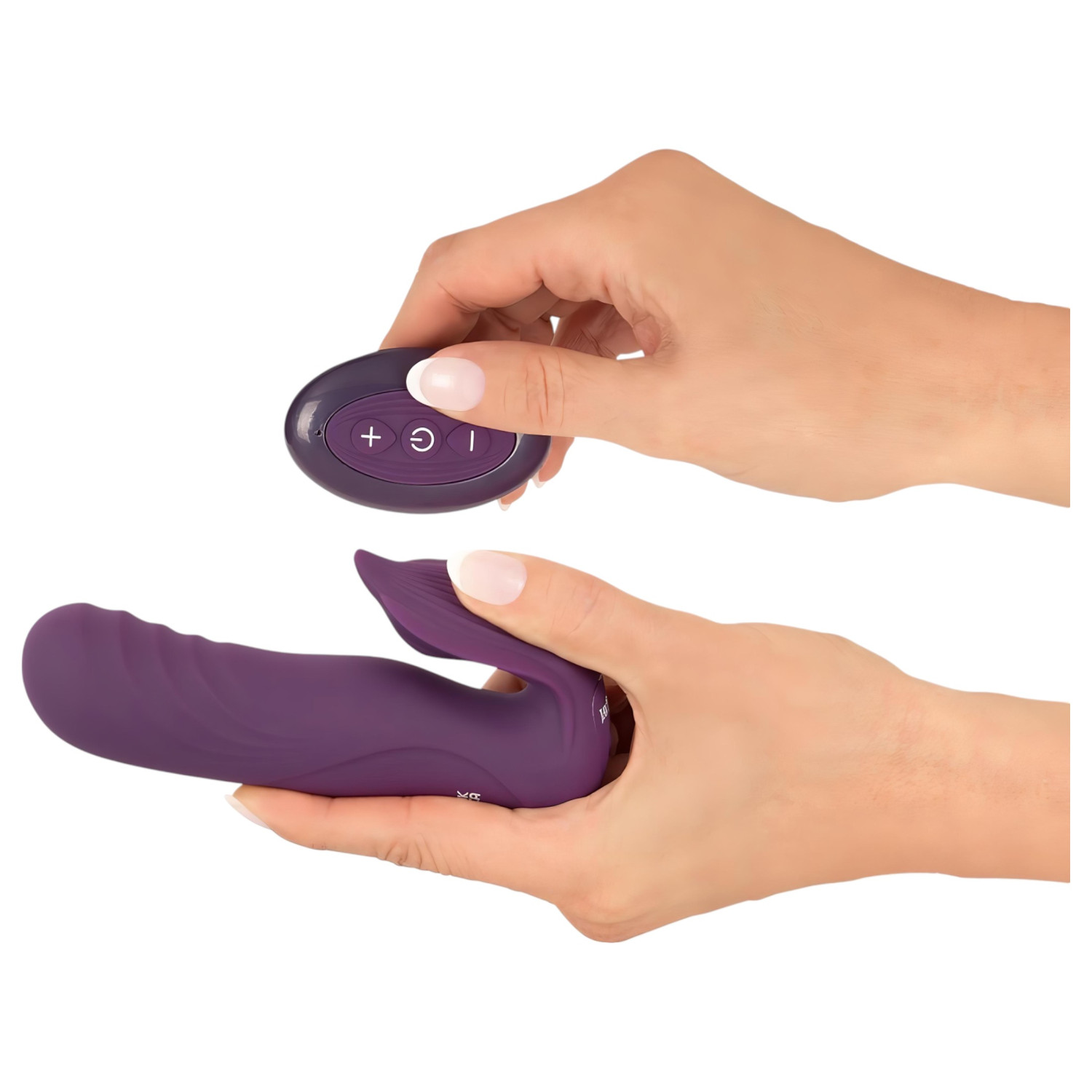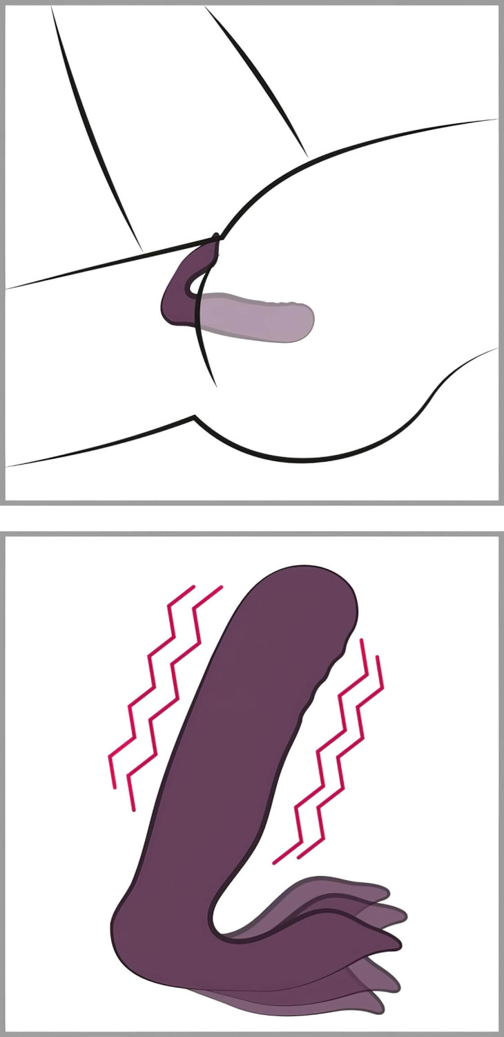 Introduce la parte larga en la vagina, asegurándote que la punta mire hacia arriba y hacia ti. La parte externa, con doble oreja, debe quedar apoyada sobre el clítoris. Importante: antes de ponértelo, enciende el aparato manteniendo pulsado el botón durante unos segundos.