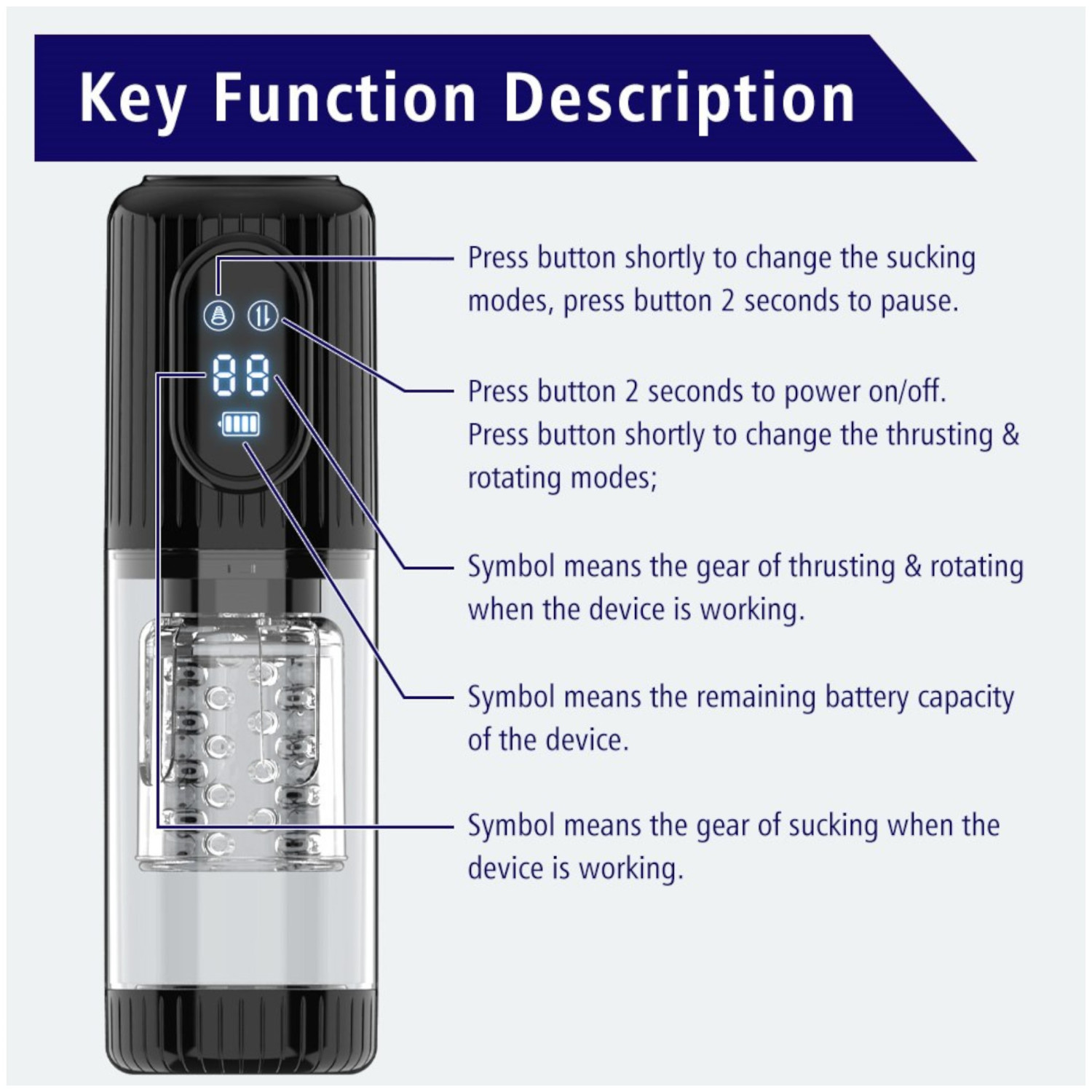Con los botones ubicados ergonómicamente, puedes regular fácilmente la intensidad del giro, empuje y succión, mientras que la pantalla LED te permite seguir los ajustes fácilmente.