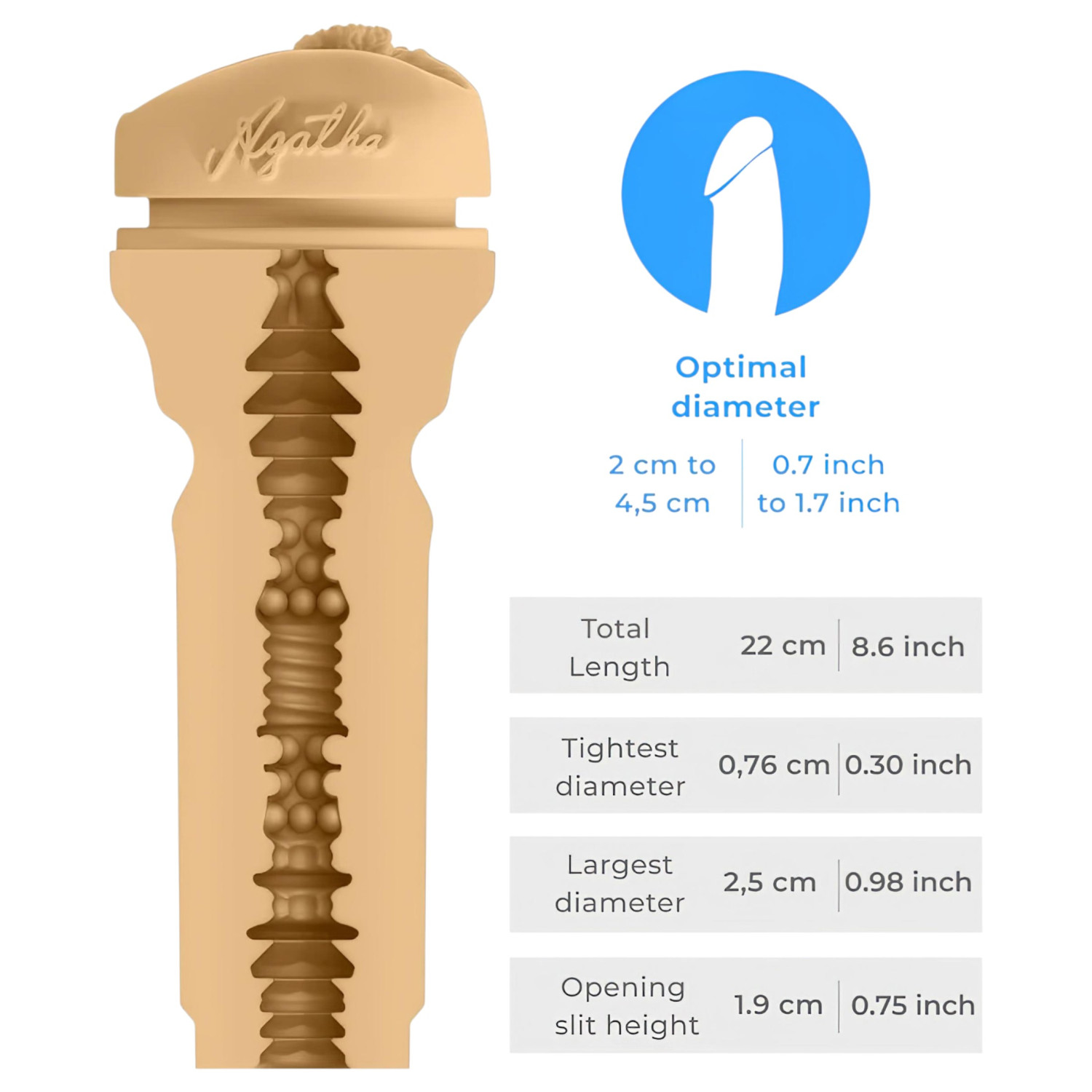 Este masturbador realista está diseñado para proporcionar el máximo placer en cada ocasión. Basado en las formas íntimas de la famosa estrella de cine para adultos Agatha Vega, te hará sentir como si estuvieras con ella en cada uso. La textura interna es extremadamente variada y estimulante, intensificando cada momento del camino hacia el orgasmo. Si deseas la experiencia manual más realista, ¡este producto es perfecto para ti!