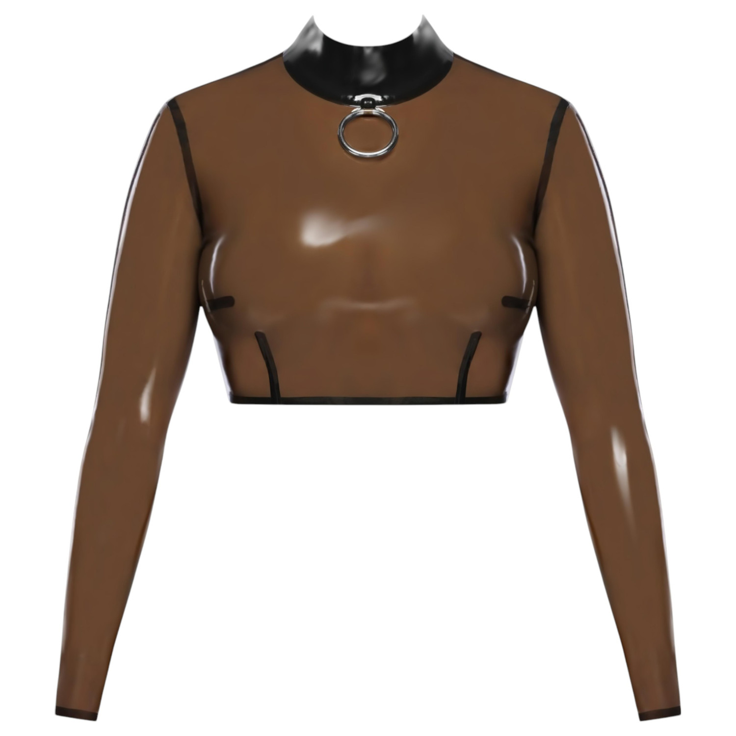• 1 blusa de látex translúcido, de manga larga y con cuello con anillo de metal