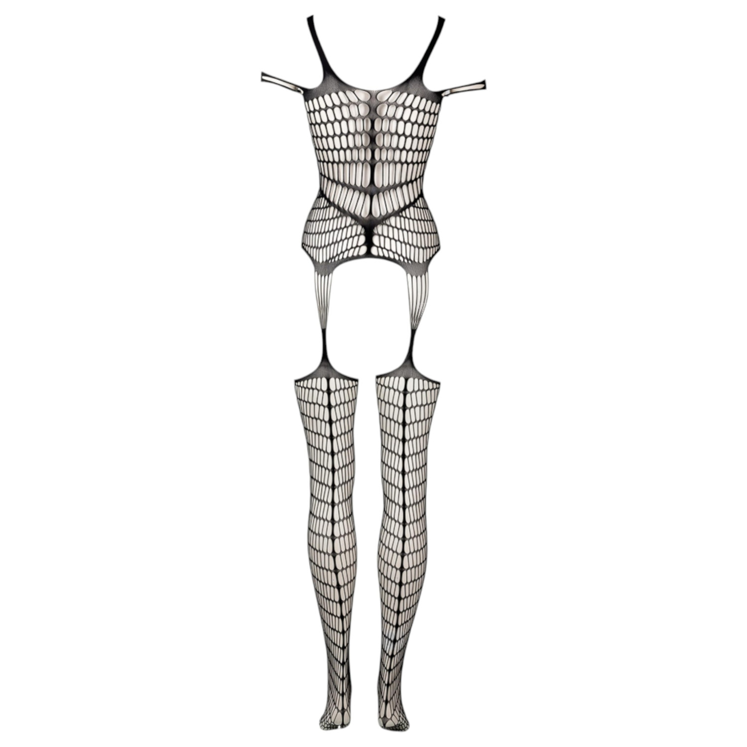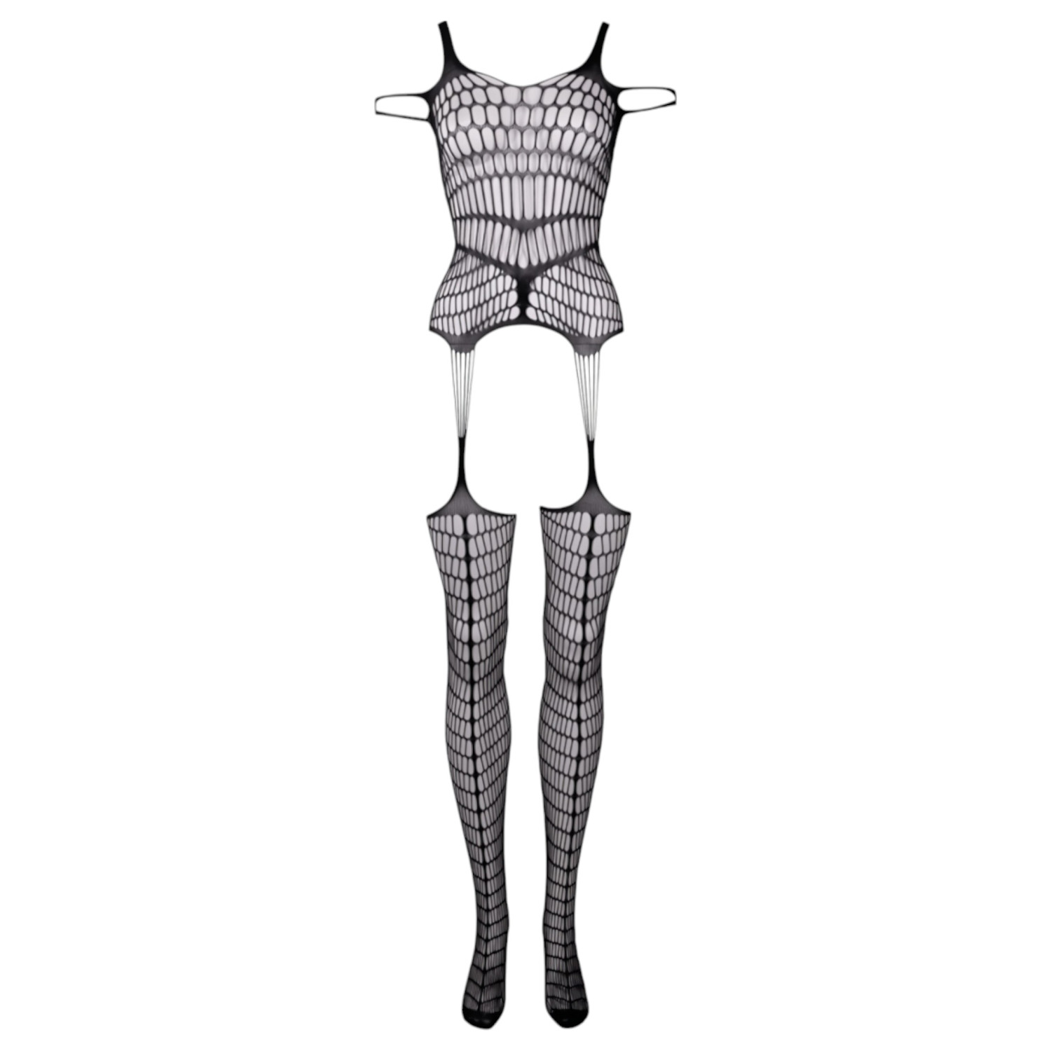 Este bodystocking estilo rasgado con liguero y paneles opacos te da un look súper atrevido y provocador - la elección perfecta para mujeres seguras de sí mismas y sin miedo a mostrar su lado más salvaje.