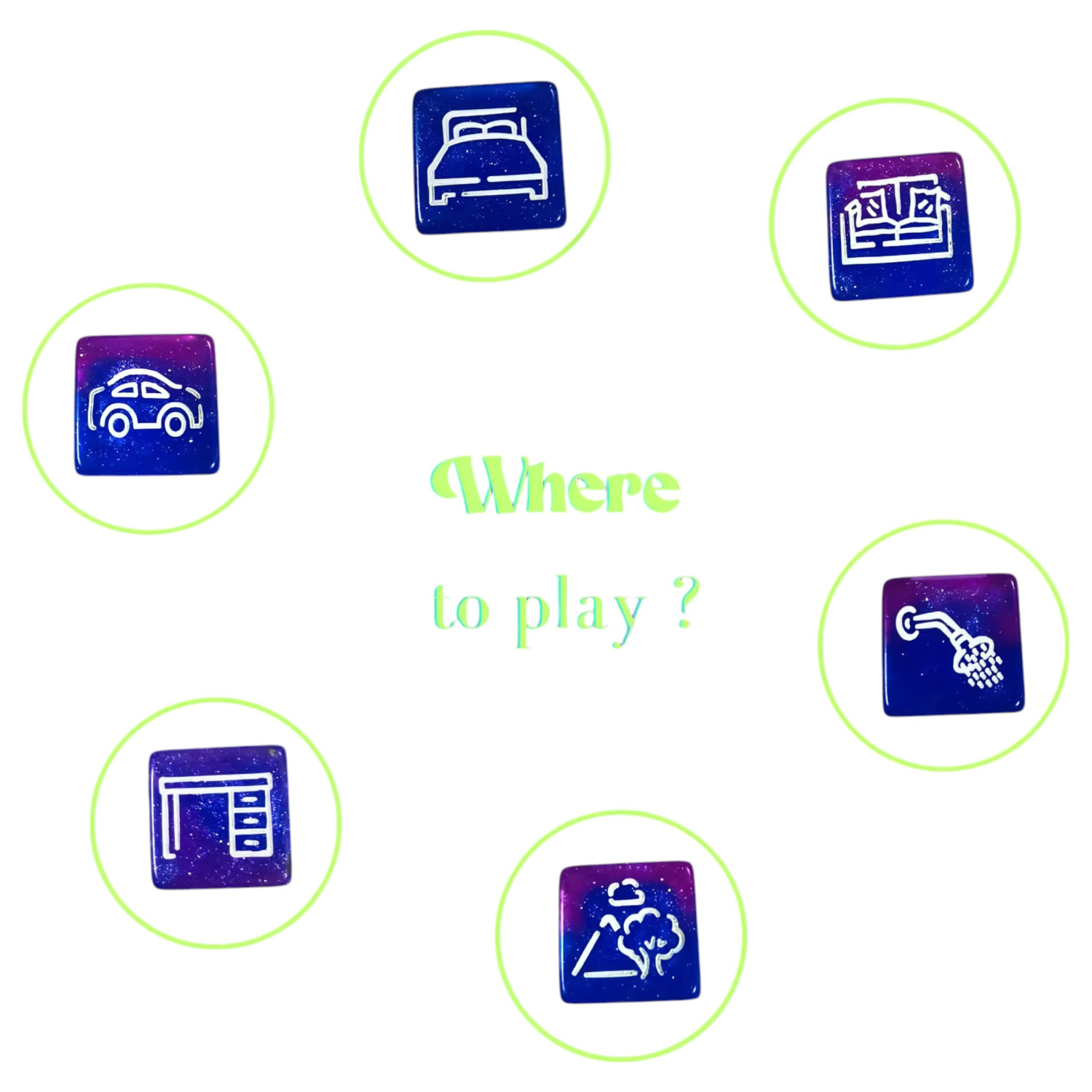 • Tres tipos de dados: Uno te da la acción, otro la parte del cuerpo, y el tercero el lugar - ¡las combinaciones son casi infinitas!