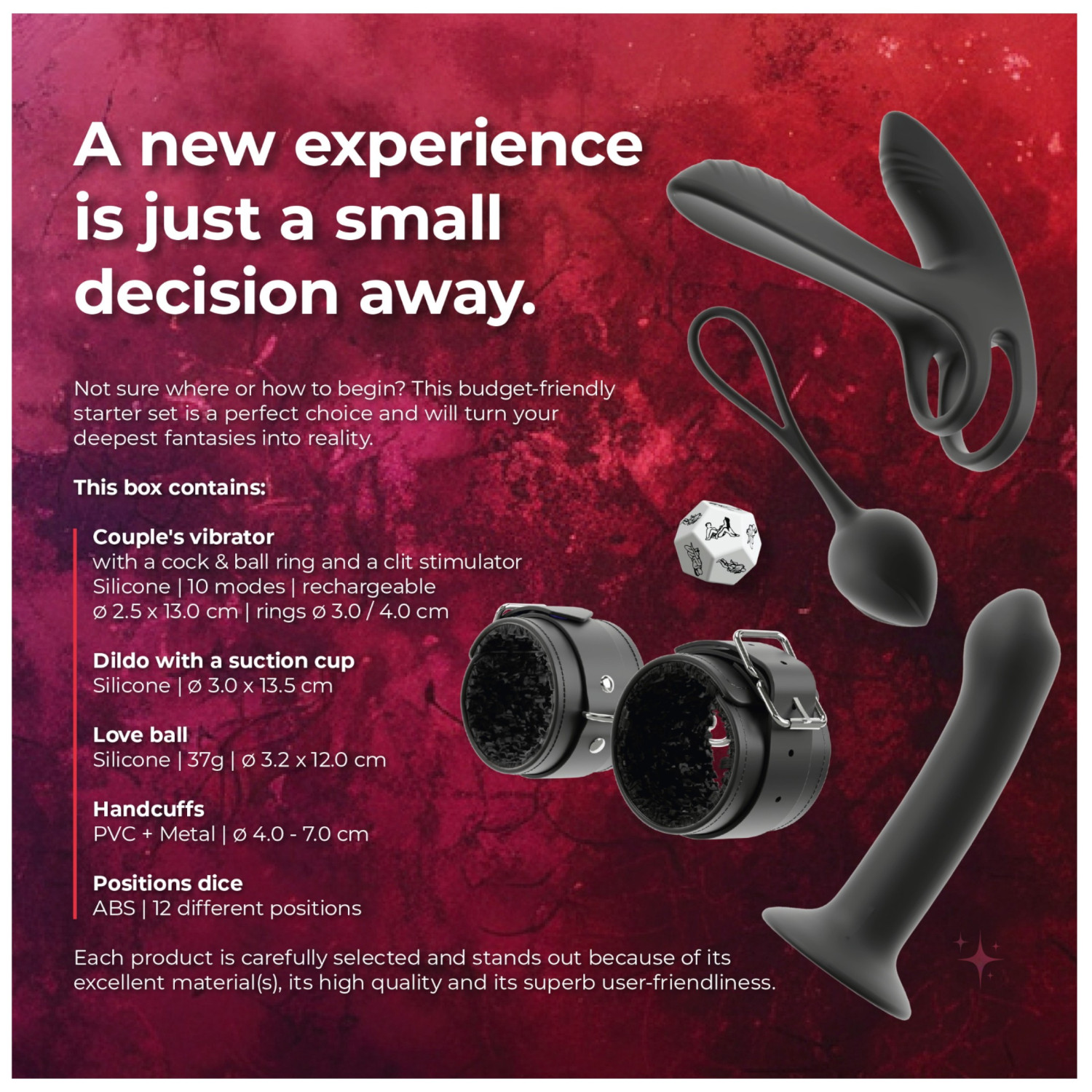 Para empezar, elijan uno o dos dispositivos y incorpórenlos en el juego previo o en el acto. Desliza el anillo vibrador hasta la base del pene (la parte del anillo para testículos puede colocarse debajo de los testículos), y asegúrate de que la parte vibradora plana mire hacia arriba para que el clítoris reciba las vibraciones durante el acto. La bola geisha puede ser usada por la mujer durante el juego previo o incluso discretamente durante el día. El dildo puede ser guiado a mano o fijado en una superficie lisa con la ventosa. Las esposas y el dado sexual se pueden usar cuando deseen un juego de roles, intercambio de roles o elección espontánea de posiciones.