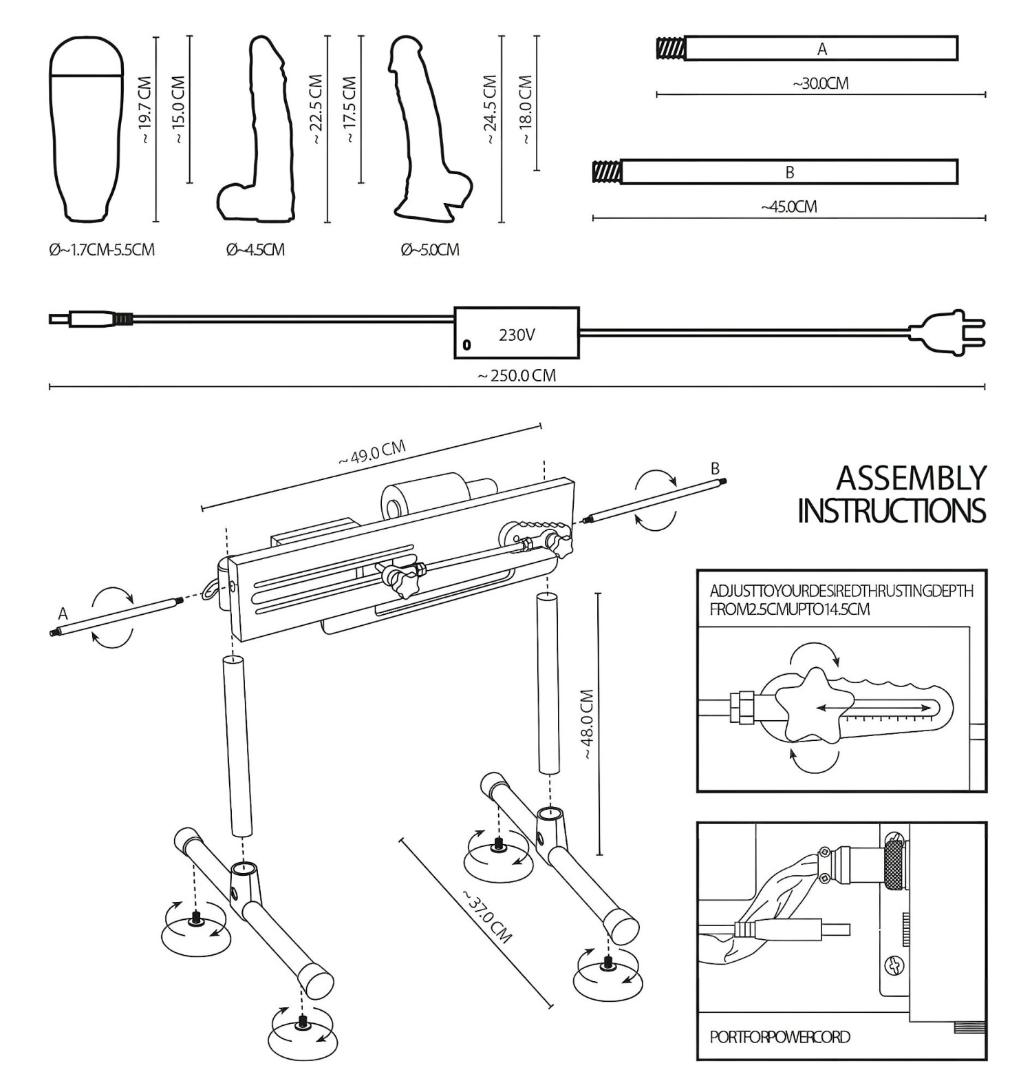 Monta las patas según el manual ilustrado, después enrosca (con la base roscada) uno de los consoladores en una barra y el masturbador en la otra.