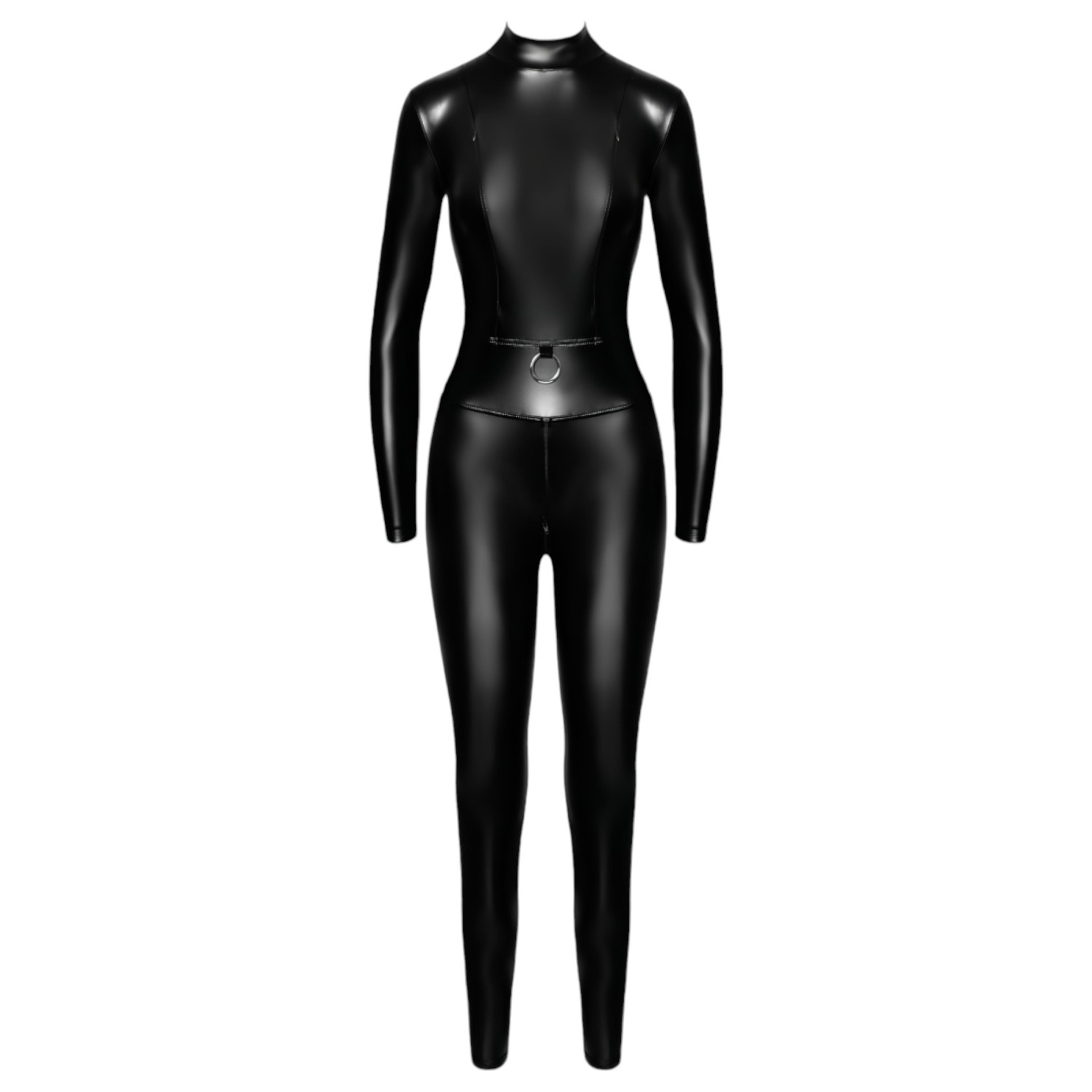Un mono largo y sexy que cubre todo el cuerpo, totalmente ajustado con cremallera y un gran aro adorna la parte frontal.