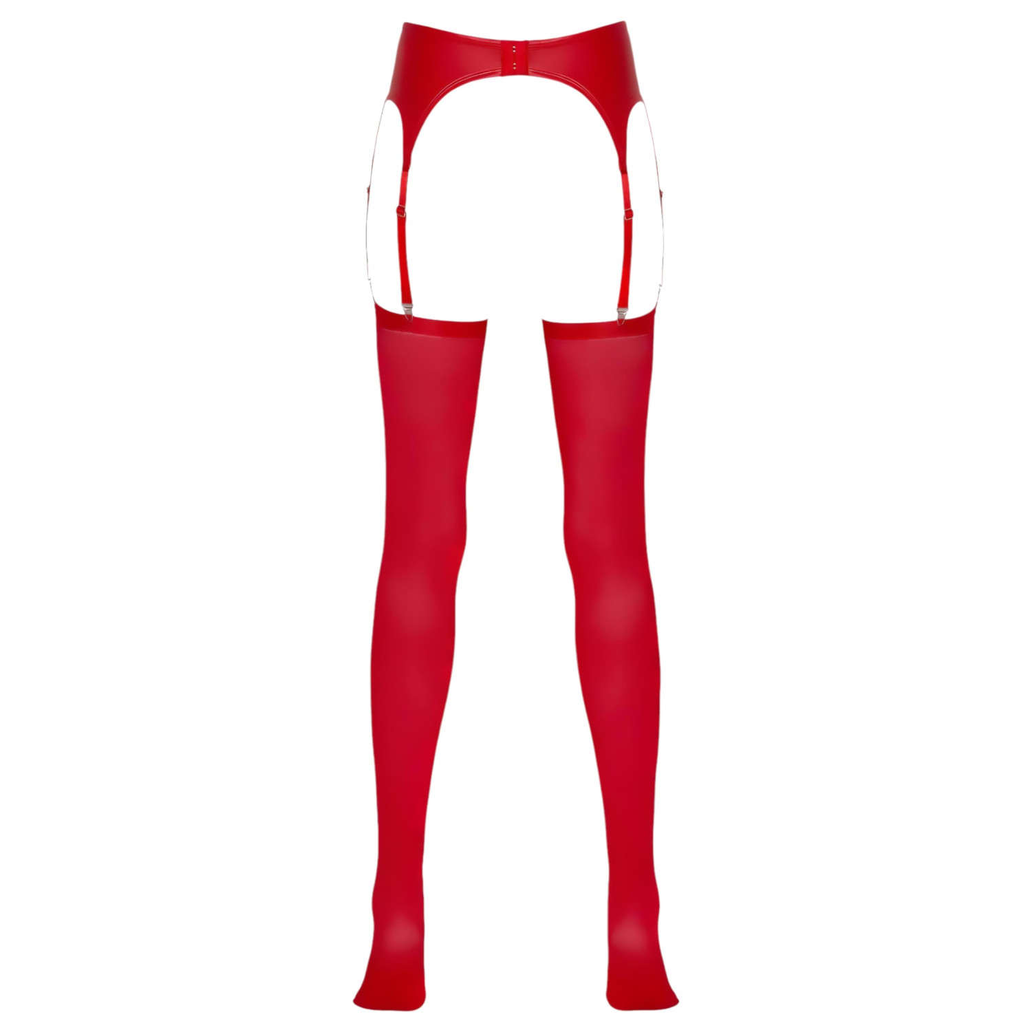 ¡Medias y liguero rojo ardiente, con detalles brillantes y espectaculares que suben la temperatura!