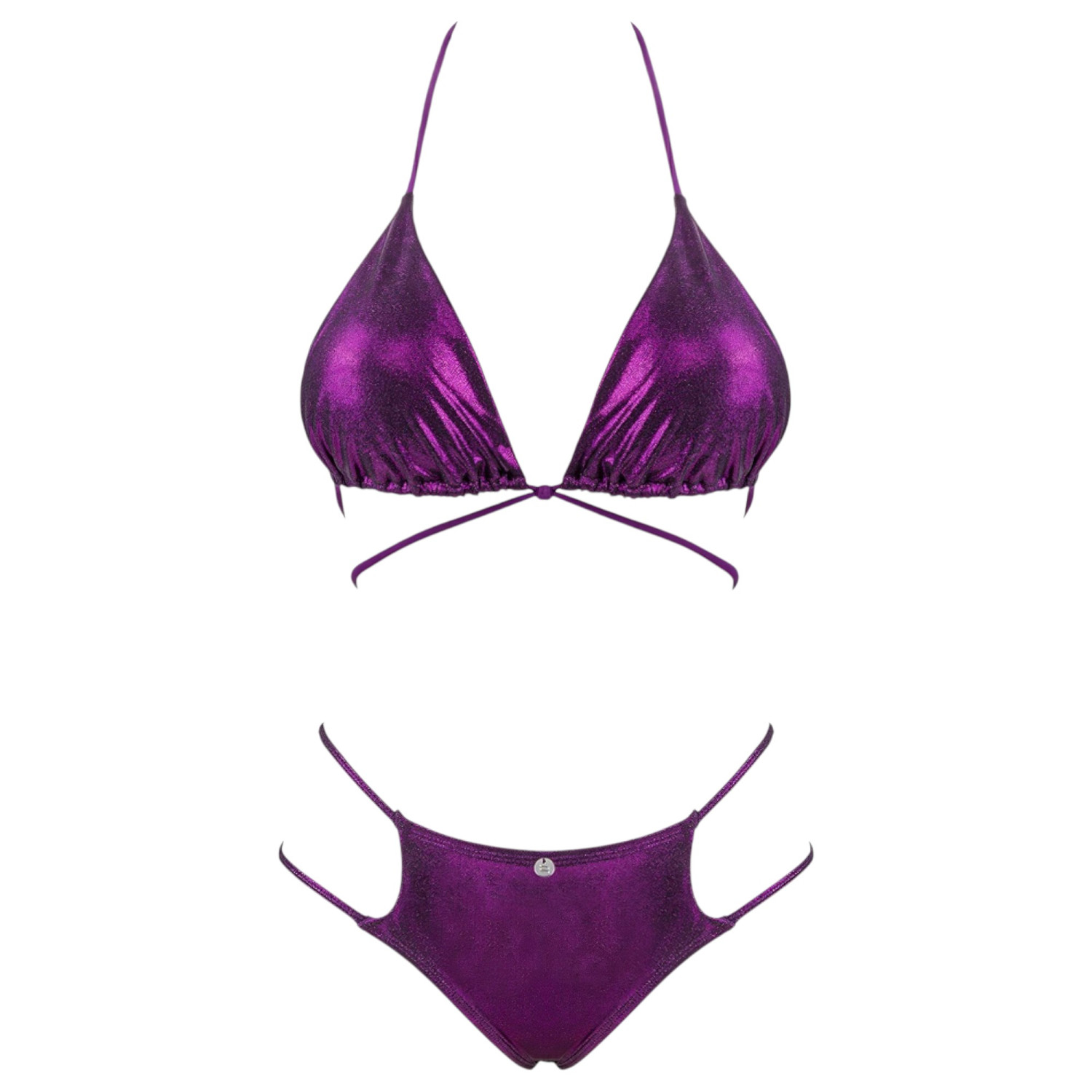 Bikini con un toque metálico súper vistoso, corte clásico de triángulo, detalles atrevidos con tiras para que te veas realmente sexy y rompedora.