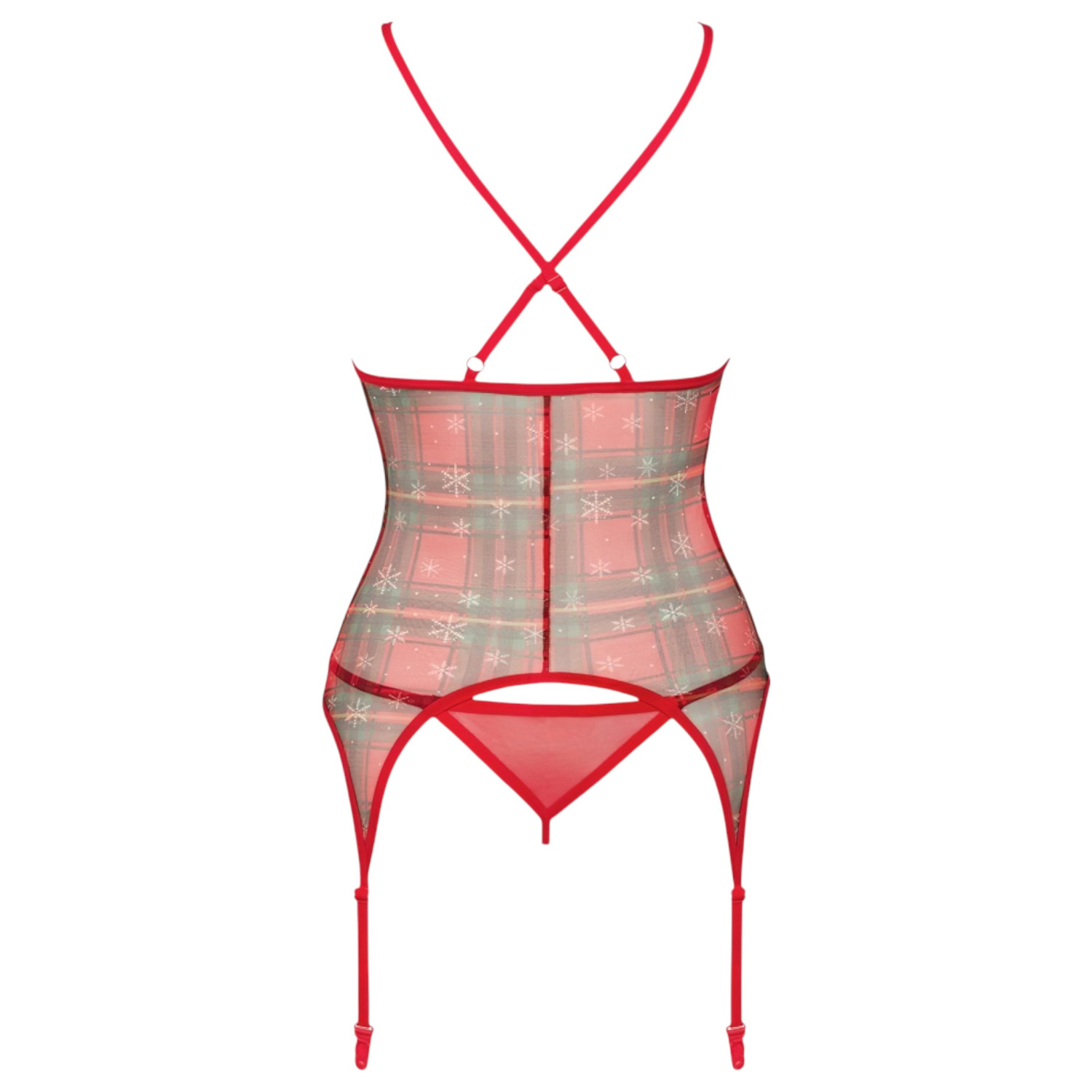 El set Obsessive Jollymore es un conjunto de lencería sensual y festiva, hecho con tela elástica de cuadros rojos y detalles de encaje.