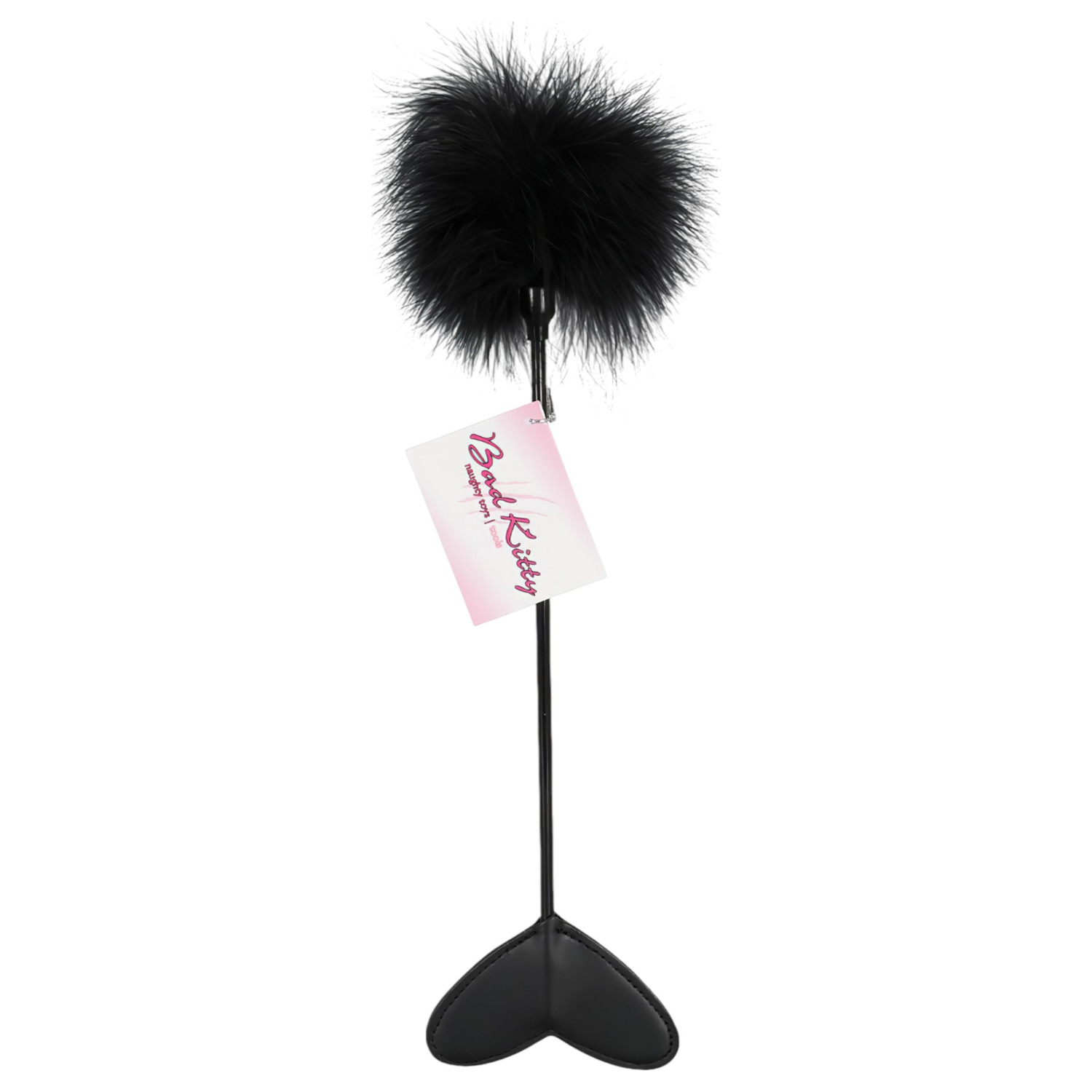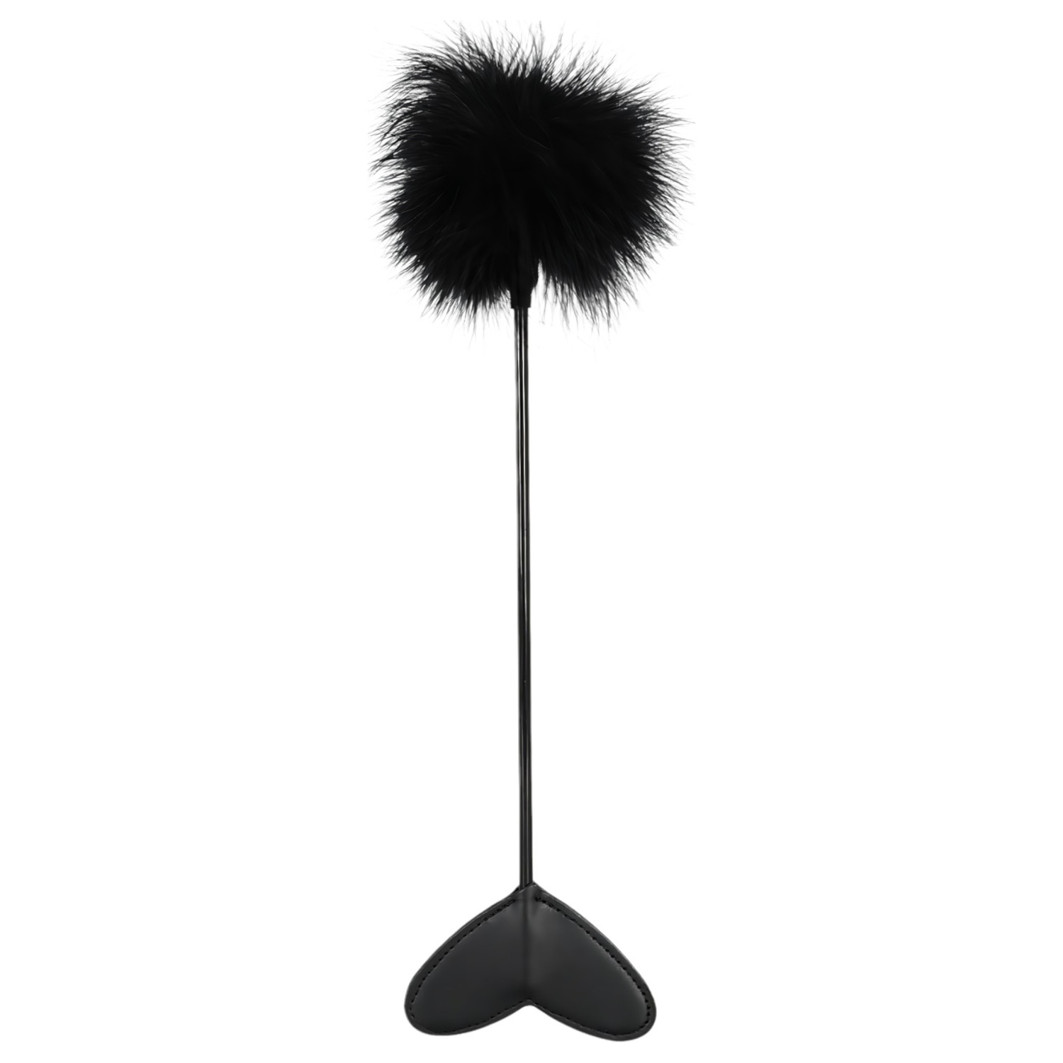 Mango negro resistente de plástico, con un pequeño pomponcito de plumas suaves y cosquilleantes en un extremo, perfecto para animar los preliminares o como accesorio para juegos de rol tipo sirvienta.