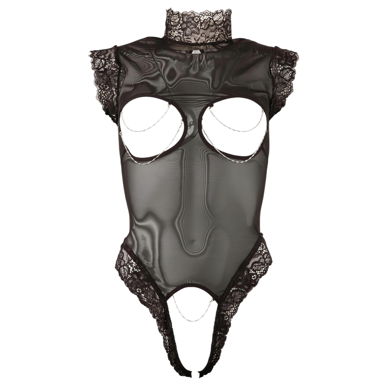 Este body abierto exclusivo es a la vez elegante y sensualmente erótico. Los detalles de encaje brindan sofisticación femenina, mientras el material transparente y los adornos de cadena desmontables aseguran una experiencia inolvidable.